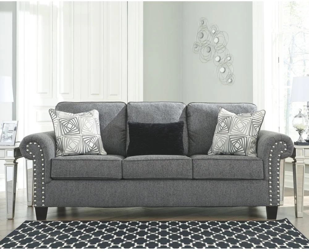 A contemporary dream. This sofa checks off everything on your list. Designer profile is accentuated with roll arms and pewter-tone finished nailhead trim. Upholstered in a textured chenille, the feel is up to par with the look. Geometric throw pillows flaunt a mesmerizing pattern. Black jacquard faux fur kidney pillow fluffs up the luxury factor. Tapered accent legs finish off top-to-bottom style.