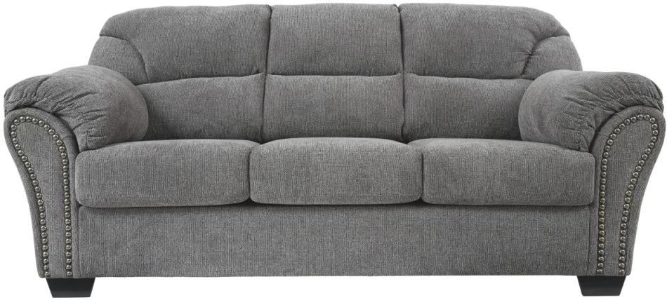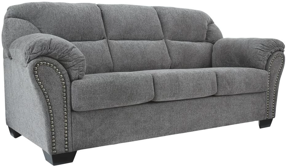 Why sacrifice comfort for style (or style for comfort) when you can have the best of both in this sofa in pewter gray. Elements include a chic divided-back design and pillow top wrapped armrests that make nodding off all too easy. Calling attention to the elegantly flared armrests—black nickel-tone nailhead trim for a punch of cool character.