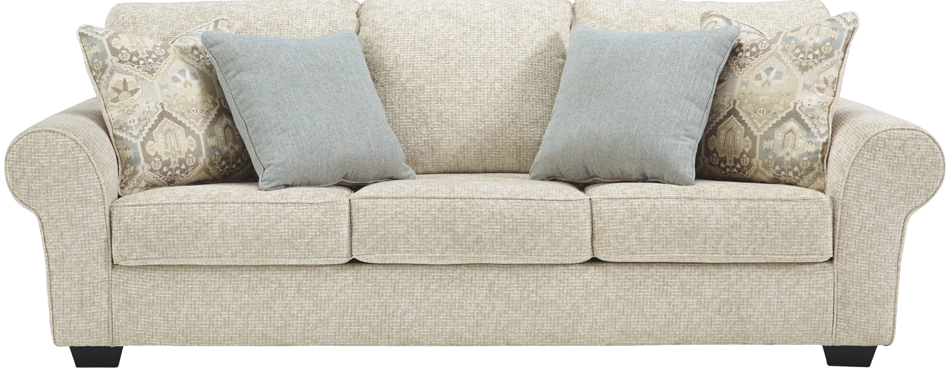 Blending classic elements like sumptuous flared roll arms with tailored box cushions and tapered black feet for up-to-date appeal, this sofa exudes that transitional aesthetic that looks and feels right at home. Offering plenty of room for everyone to make themselves comfortable, this large-scale sofa is wrapped in a soft, chunky weave fabric loaded in texture. Light and lovely ivory upholstery makes for such an easy-breezy blend.