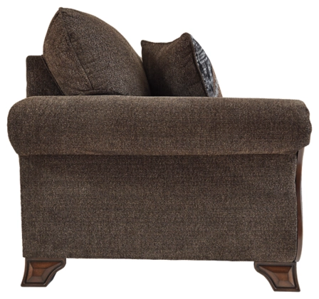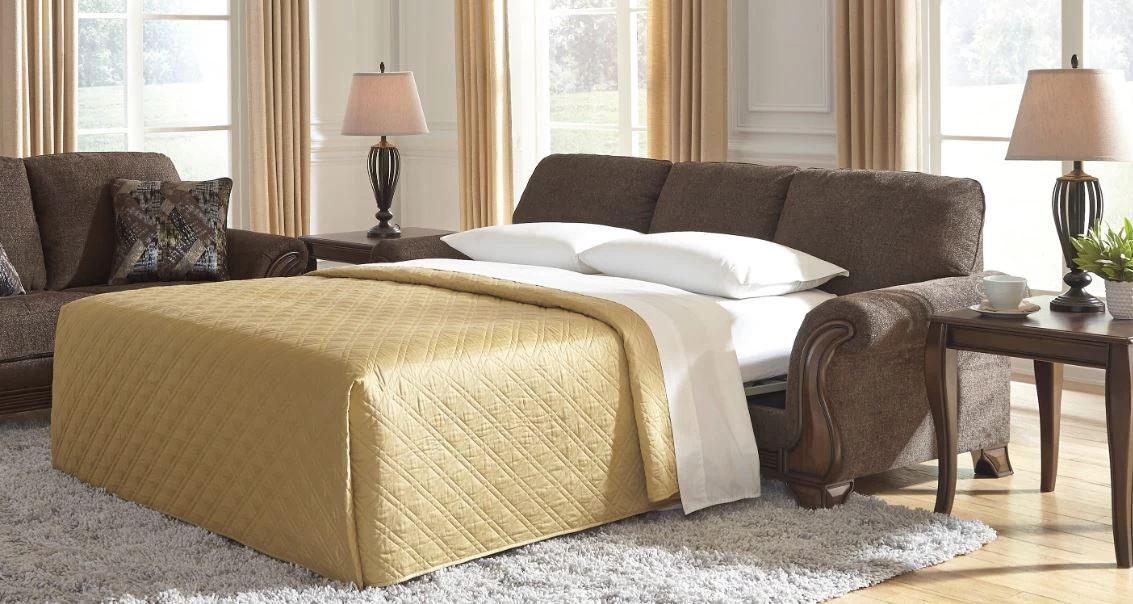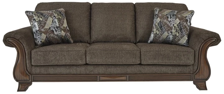 A curvaceous beauty, the Miltonwood queen sofa sleeper will make you happy you’re a traditionalist. Fancifully turned feet, rail and arm panels mimic the painstaking details of years past. Loaded with modern comfort, the thick cushions are covered in a decadently plush teak brown upholstery sure to complement so many color schemes and stand the test of time. Crafted of quality memory foam, a queen pull-out mattress comfortably accommodates overnight guests.