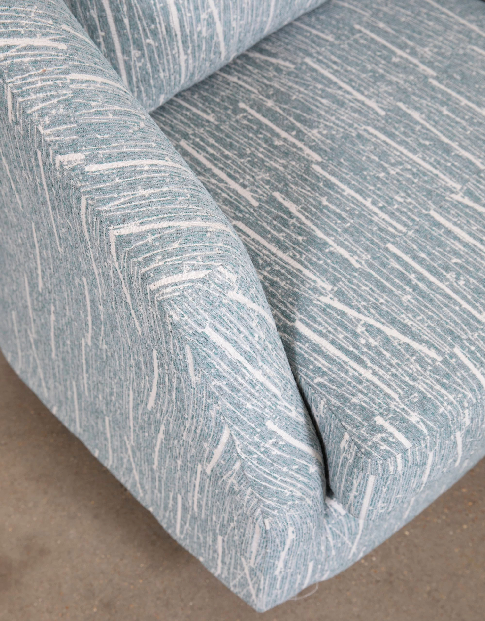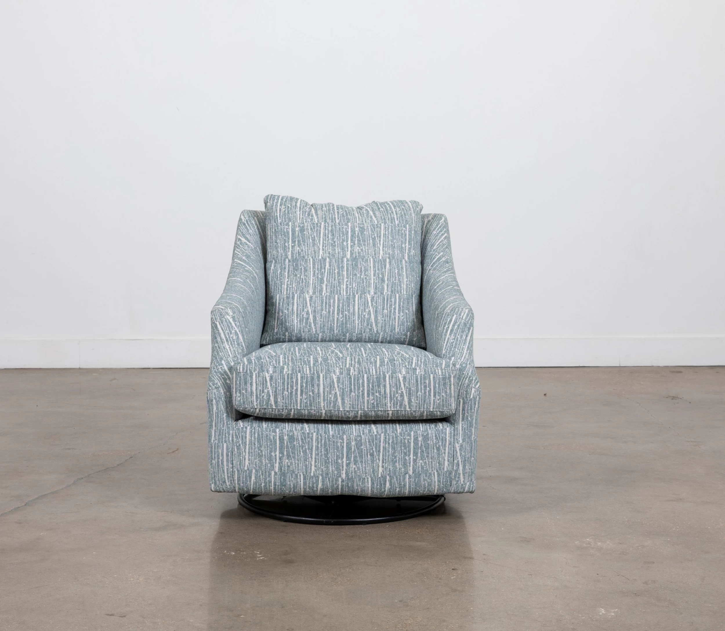 A trim, modern design that features padded arms that slope from the back to the slightly flared, inset front arms. The reversible seat cushion is soft and cozy. The loose pillow fiber back sits between the top arms also features a bottom zipper for fiber adjustment, and both it and the seat are accented with minimalist French seaming. The Flutter Swivel Glider will help you relax in style.