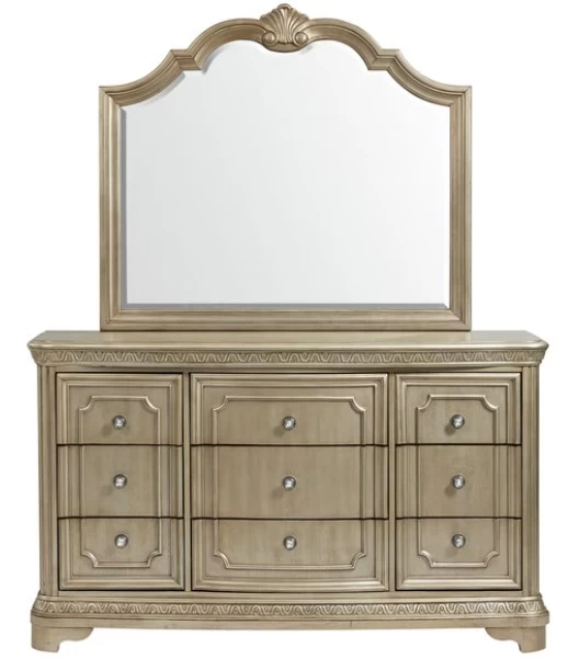 The Vincenza bedroom collection will make a glorious statement in any room with its champagne finish and intricate frame moldings. This set features a foam filled upholstered headboard, neatly covered in a cream PU fabric, and finished with crystal buttons in the tufting. The case pieces share the same crystal detailings on the drawer knobs. The Vincenza brings elegance and luxury to your room with black felt lined drawers and dovetail drawer construction. This is will be the centerpiece of your home.
