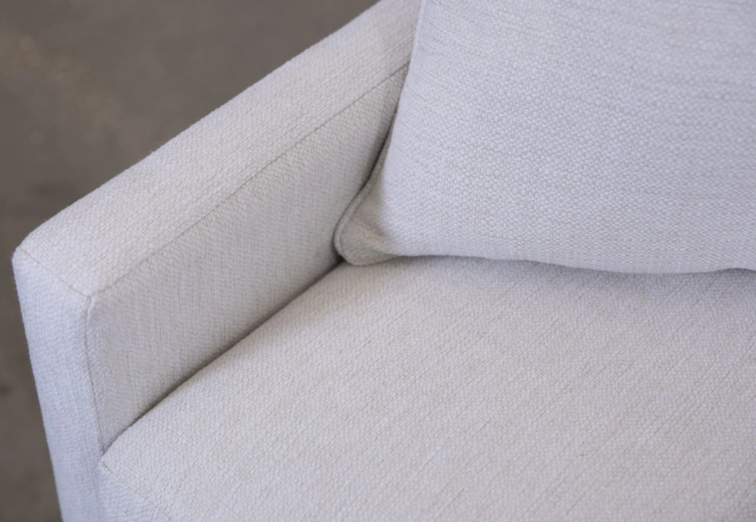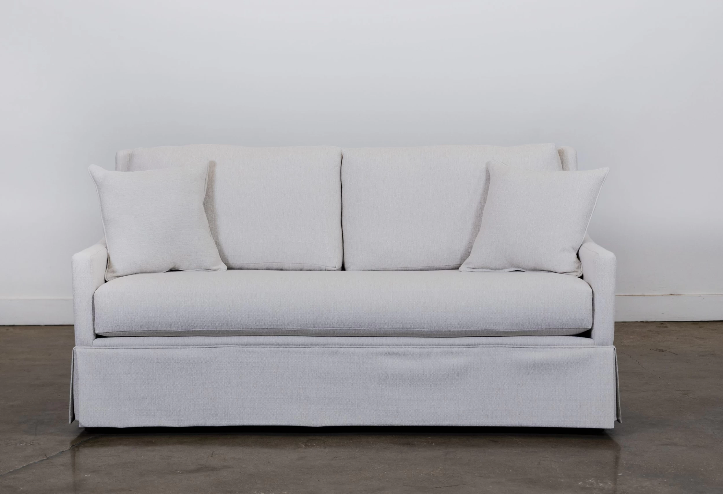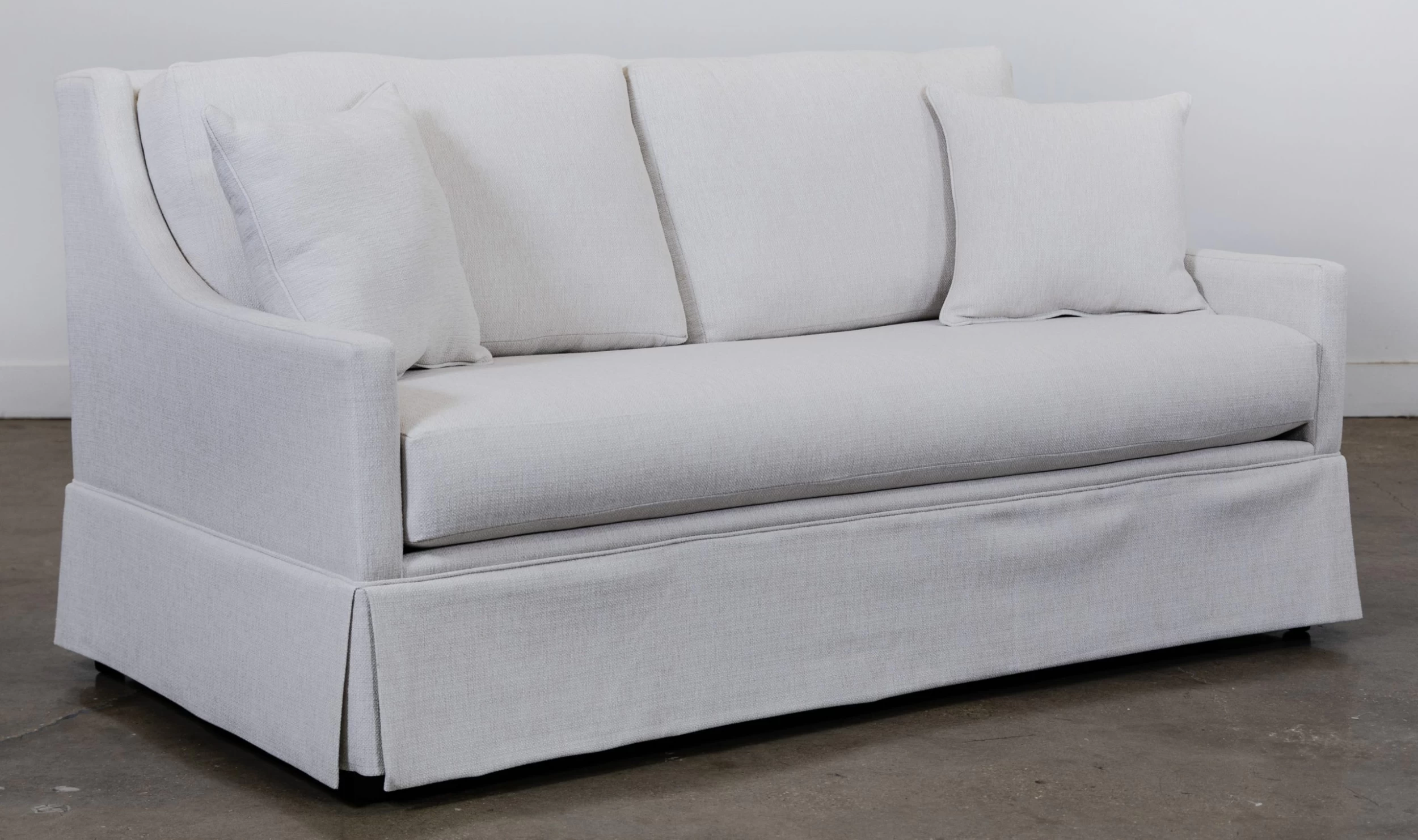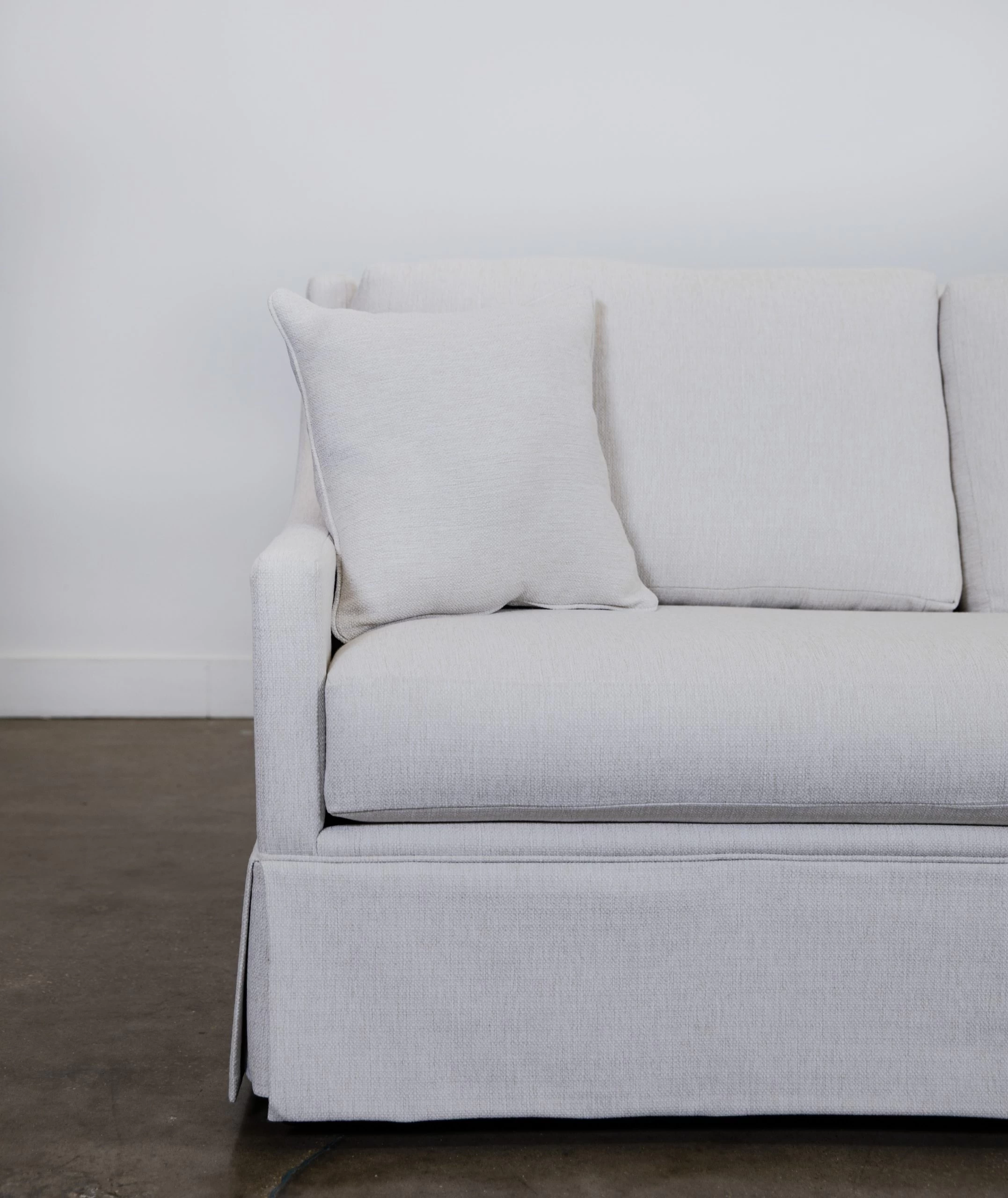 This skirted sofa features 2 encased back pillows over a bench seat. It is in the Zeus Pearl fabric which is a performance fabric to help keep it clean!