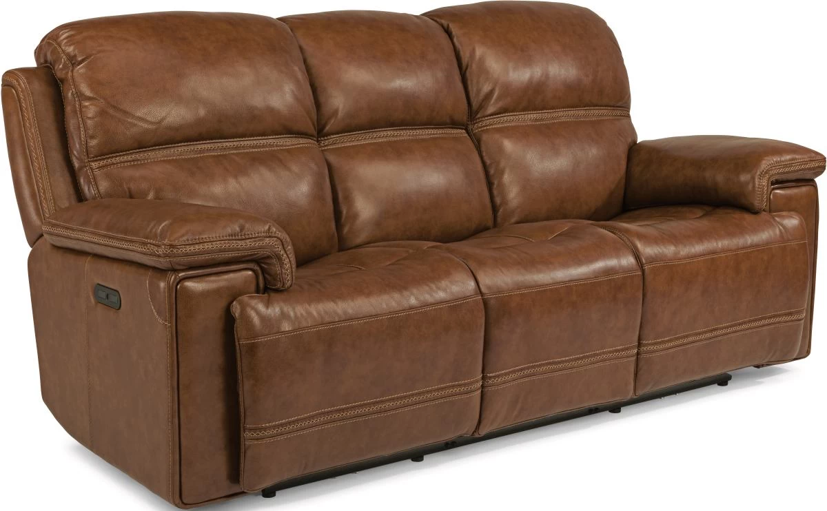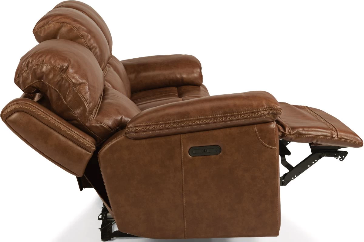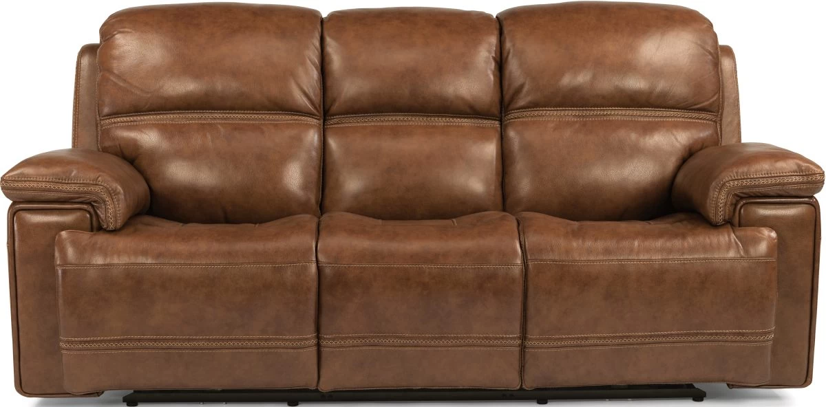 End-to-end structure from pillow pad arms highlight the divided back cushioning and contoured seating. Equipped with power headrest, reclining, and 2 luxurious footrests in warm leather upholstery, this sofa is a true trifecta of comfort, style, and function.