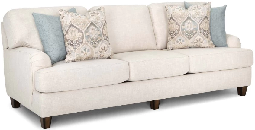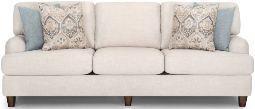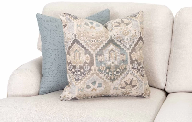 The 886 Kaia sofa features plump cushions, pleated arms, and a woven Linen-colored upholstery. The Kaia offers a fresh, new look on a classic frame with gorgeous neutral upholstery, accenting throw pillows, and solid wooden legs with a two-tone weathered mocha finish.