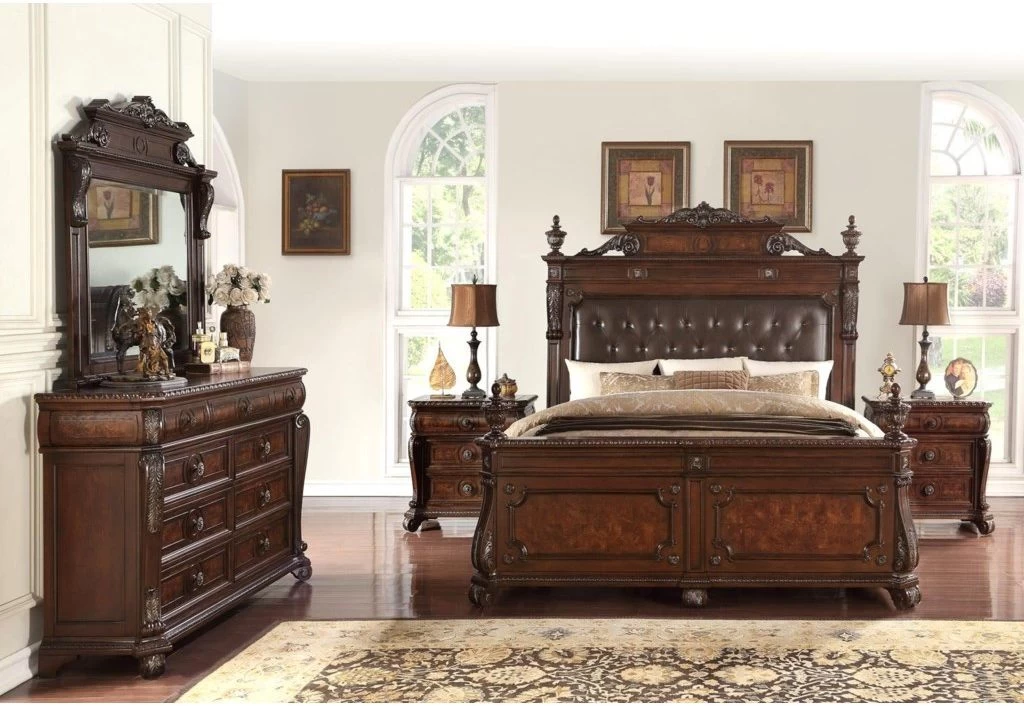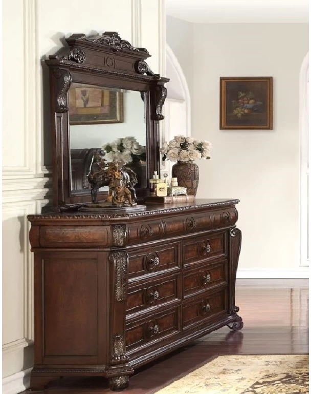 A magnificent expression of Renaissance-inspired embellishment in full relief detail, the Vintage series embraces exquisite architectural embellishments and lavish finishes. The Vintage Renaissance style features an impressive dark brown finish, elegant and smooth wood carvings, all complemented by a beautiful antique hardware finish and a Valspar finish. Some pieces also feature laminated ma