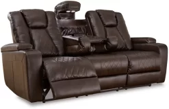 This double reclining sofa provides supple upholstery, powered controls, and extended footrests that let you rest easy.