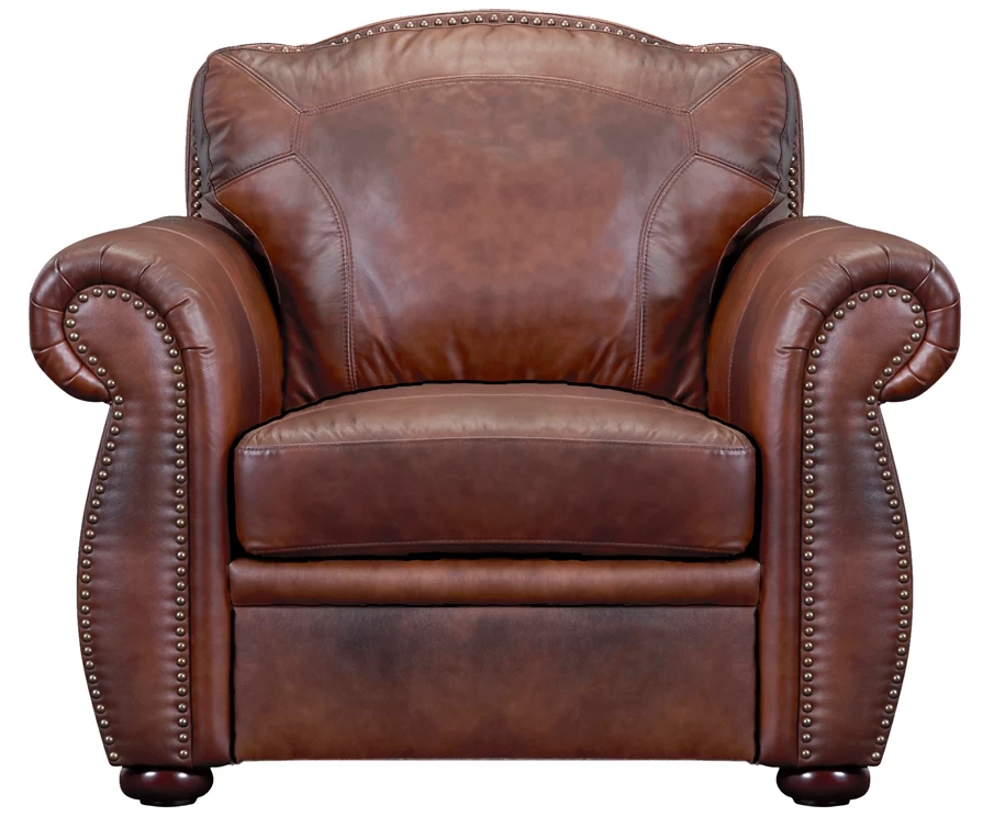 The Arizona is a full sized Chair upholstered in luxurious leather throughout, with padded front sides and back with hand crafted nail head trim. Beautifully sculpted rolled arms and detailed solid wood feeet make this a wonderful addition to anyone’s home.