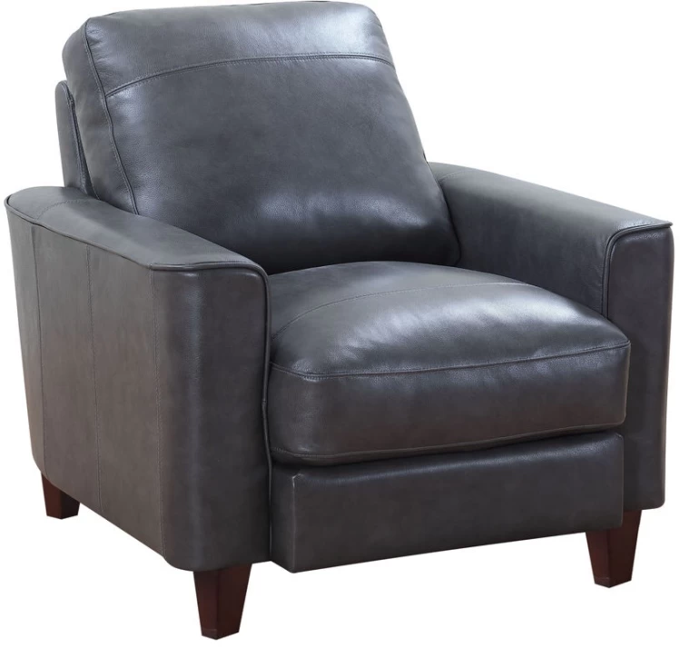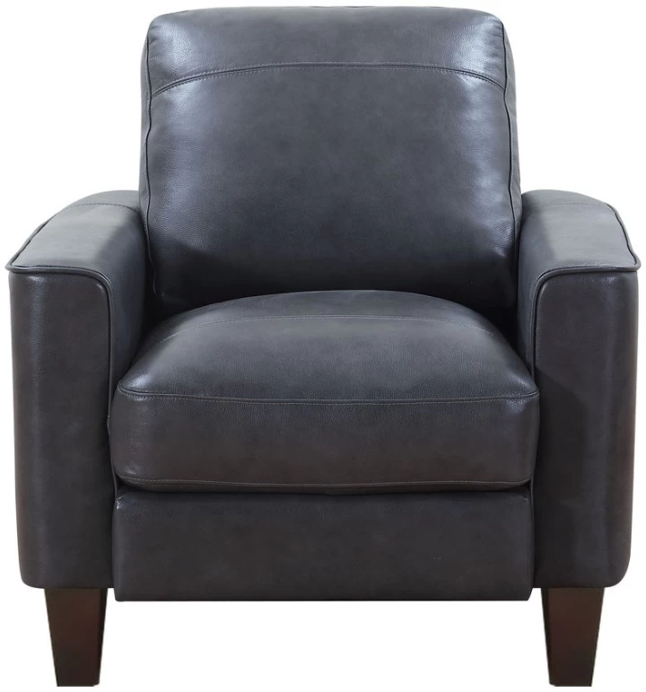 Give your furniture a new up-to-date look with this contemporary chair. With its track arms and tapered wooden legs, you’re sure to love the crisp details of its linear nature. You’re sure to love the comfort that its genuine top grain leather upholstery provides, giving you the best of style and functionality all in one piece. Leather outlasts fabric four to one having a useful life of fifteen to Twenty years compared to four to five with some fabrics. Leather will not tear and is half again as strong as any fabric, even along the seam lines. Colors are absorbed by the leather and will not rub or fade.