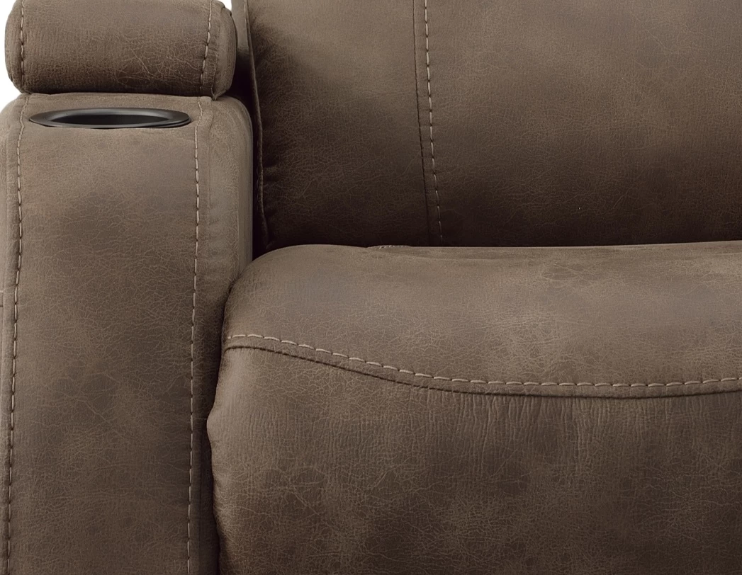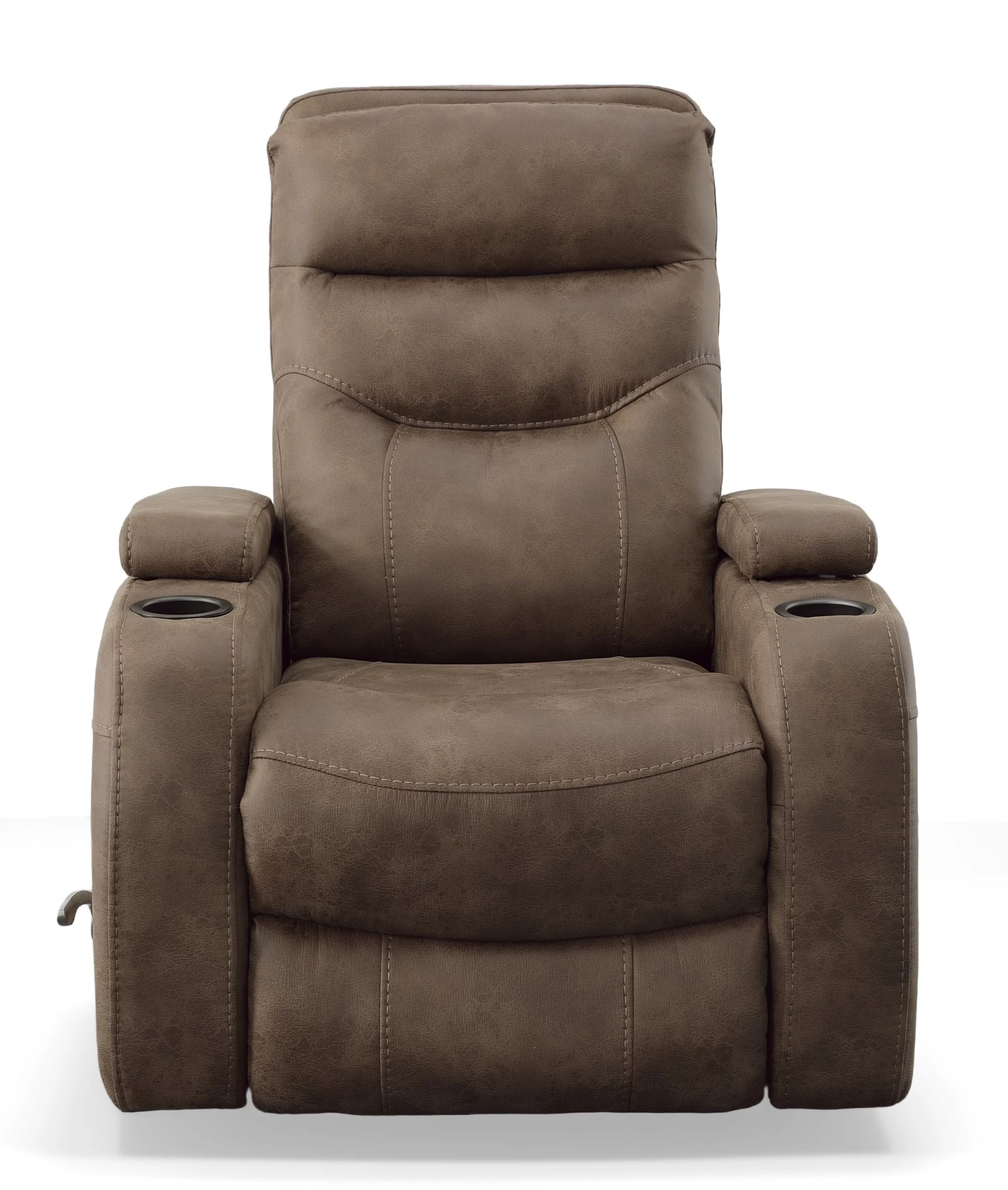 This swivel glider recliner by Man Wah features two cupholders and a handle on the side for the reclining positions. It is upholstered in a performance fabric, making it easy to keep clean.