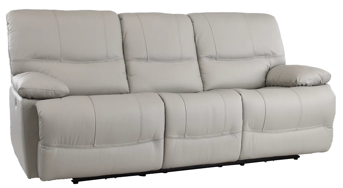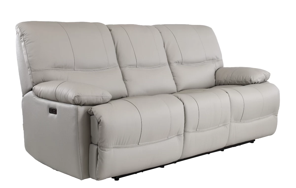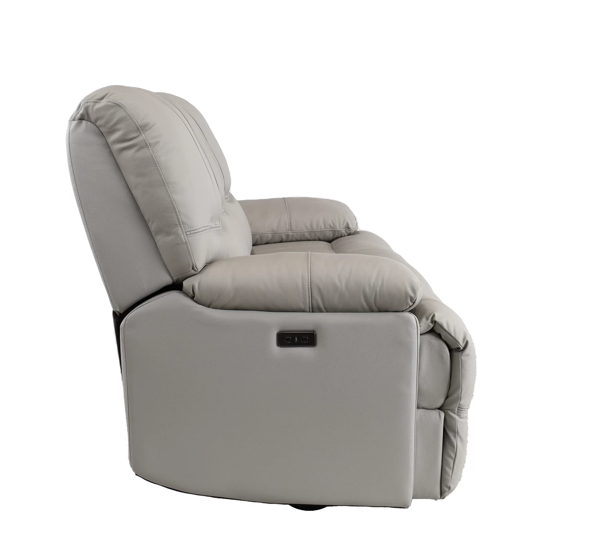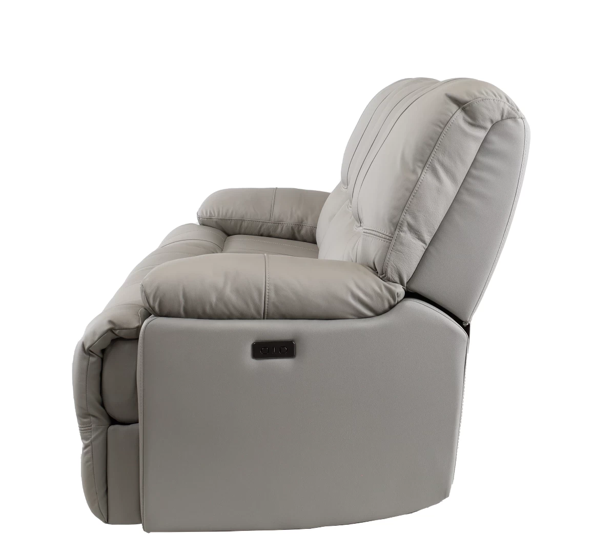 This power reclining sofa is featured in a light grey leather. It also has zero gravity recline for ultimate comfort.