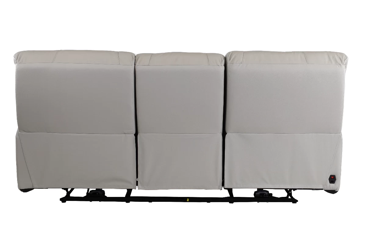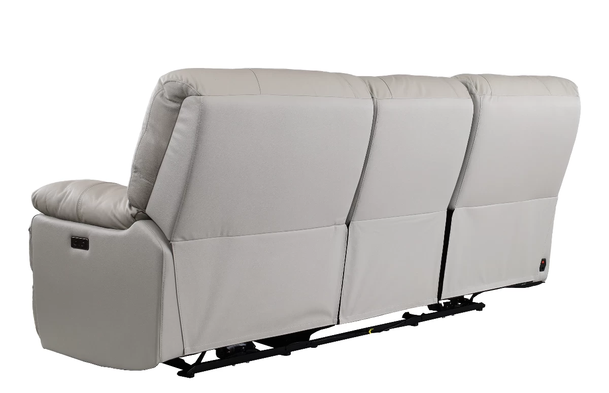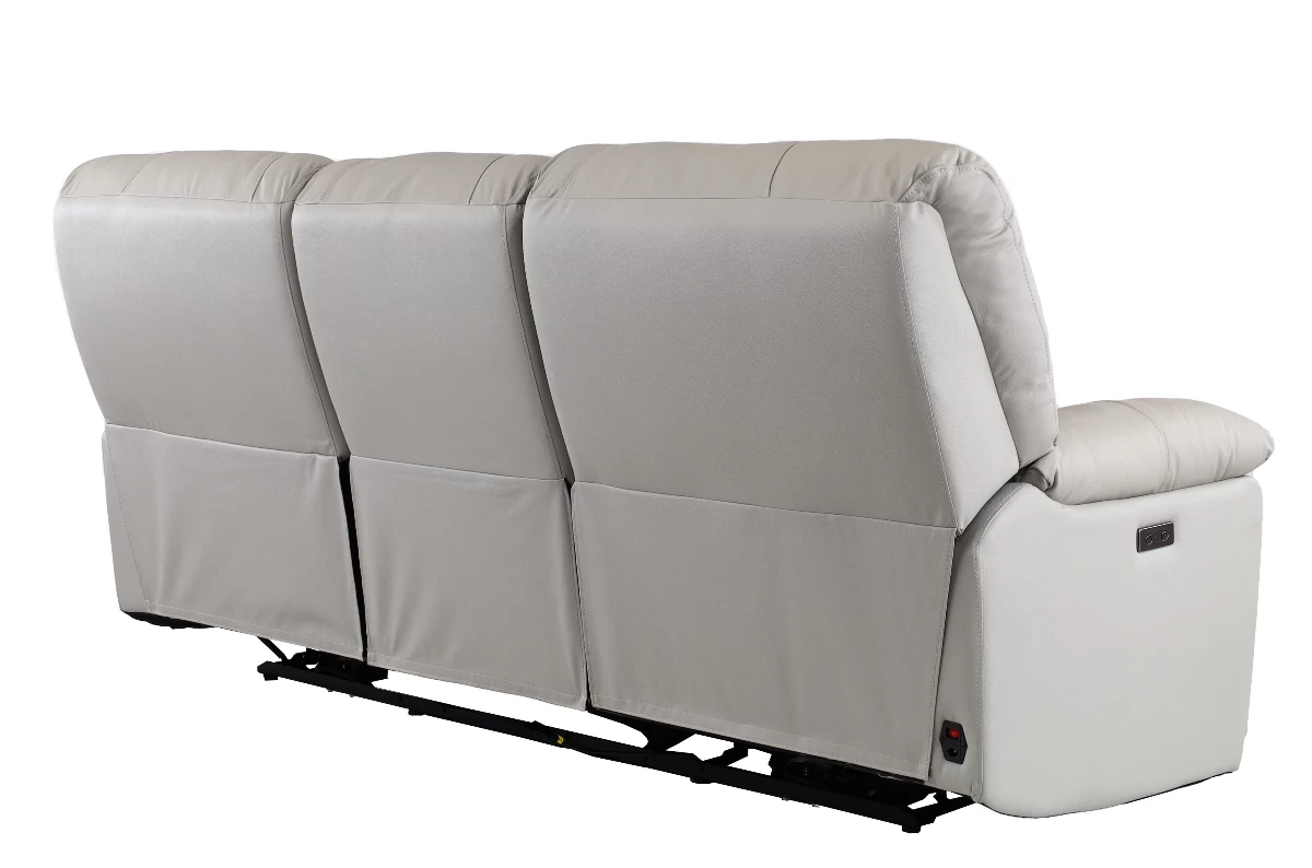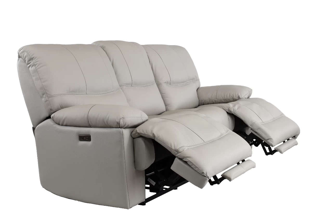 This power reclining sofa is featured in a light grey leather. It also has zero gravity recline for ultimate comfort.