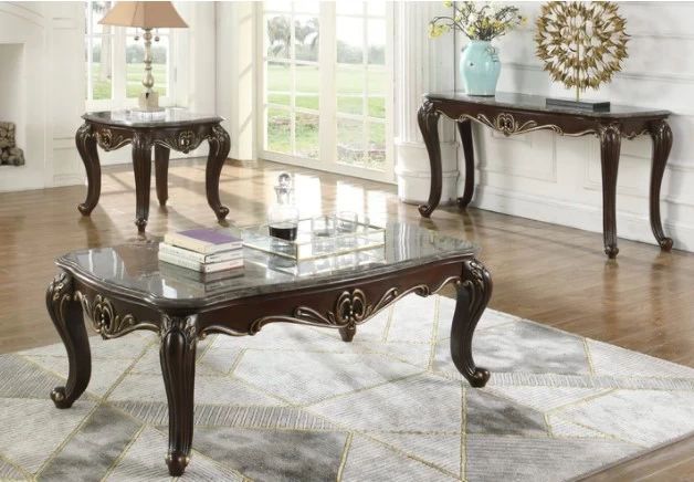 The Constantine Console Table features a cherry color, curved legs and a unique design on the base of the table.