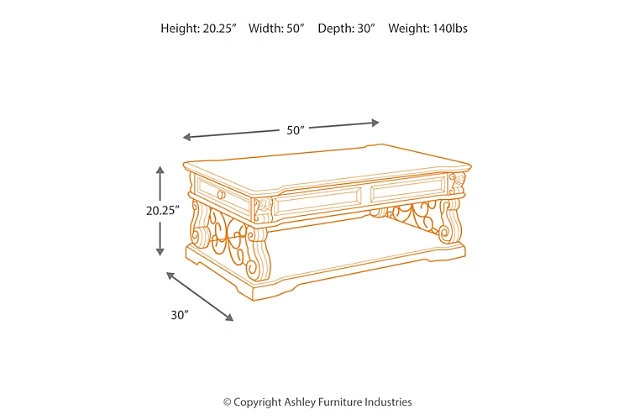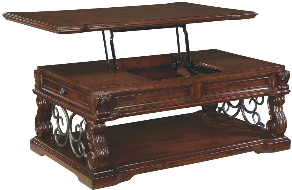 Give your living room a dash of grandeur with the Alymere cocktail table. Lift the tabletop for a convenient work space or impromptu dining area and keep odds and ends in the 2 drawers.