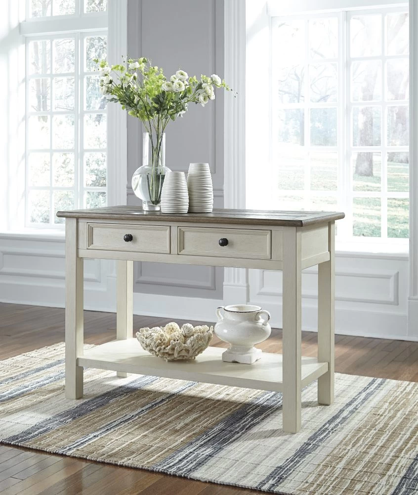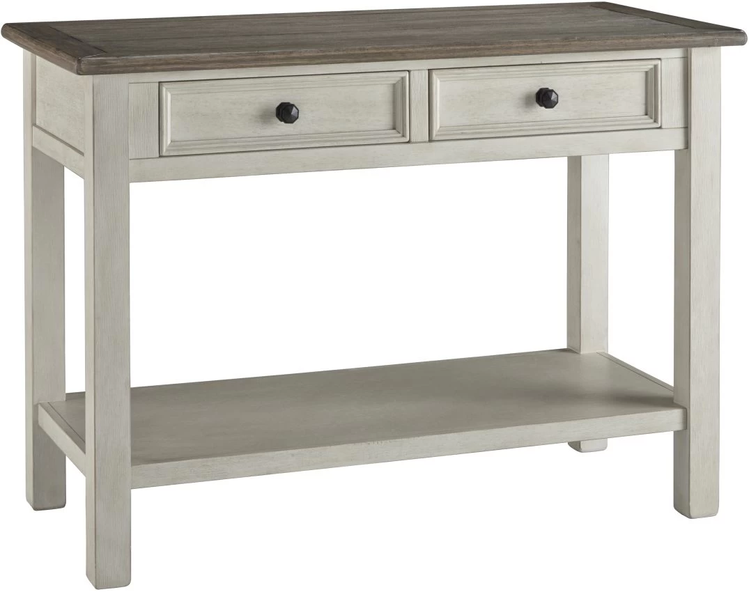This sturdy Bolanburg sofa table is the perfect place for showing off design accents in your home. The 2 shelves display what you like, and 2 drawers keep what you want out of sight for a clean and clutter-free space.