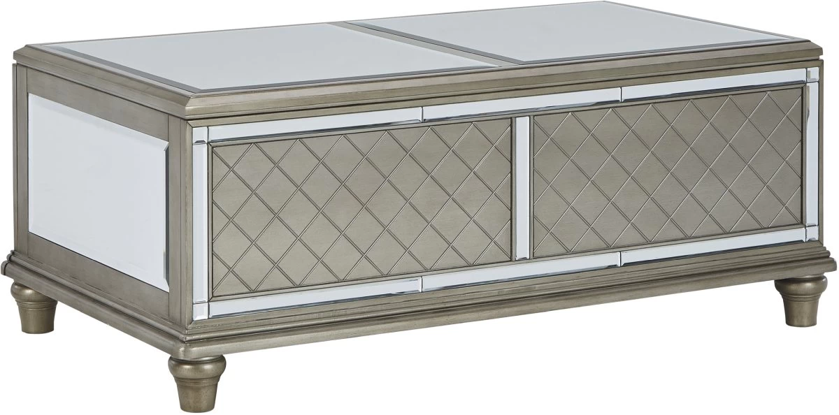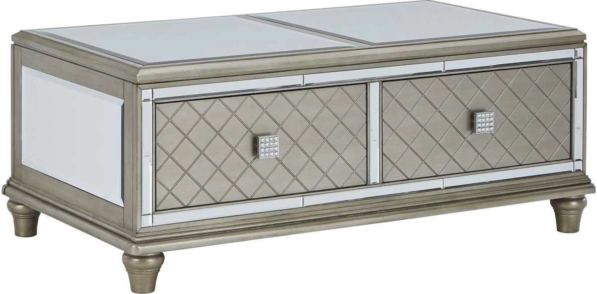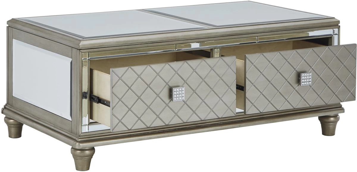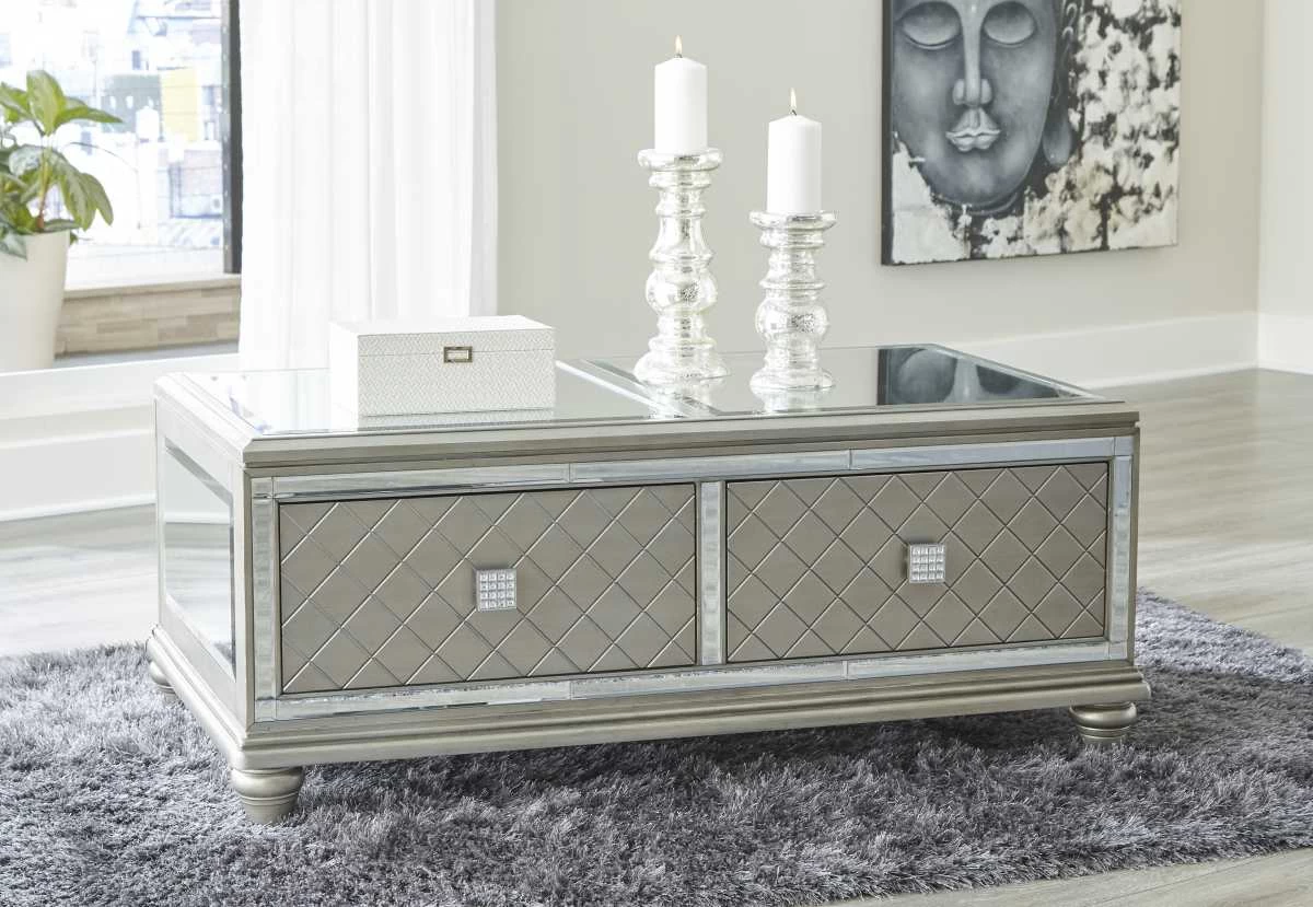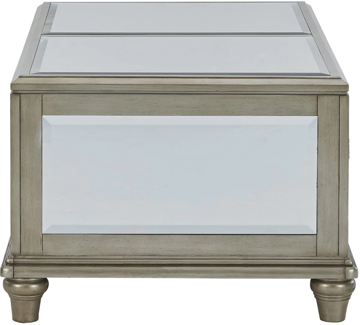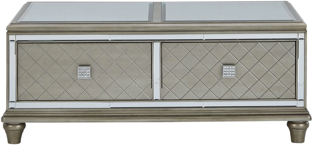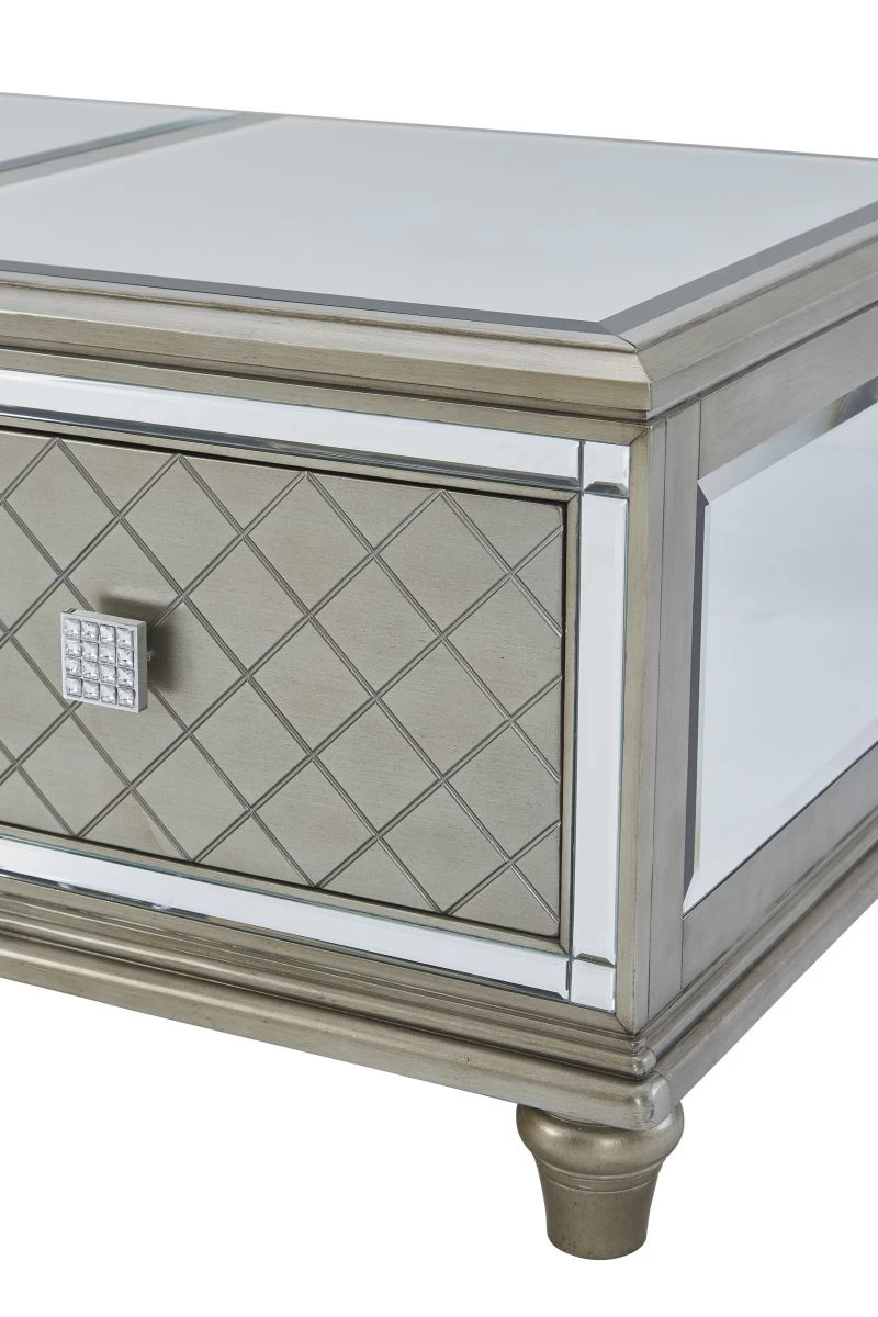 Glamorous, chic and sophisticated. This rectangular coffee table is made with a metallic silvertone finish, inset beveled mirror panels and drawer pulls adorned with faux crystals. No matter how you style it, this table is a stunning addition to your contemporary decor.