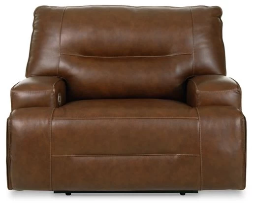 Leather throughout the seating area, inside back and armrests; faux leather covers remaining areas