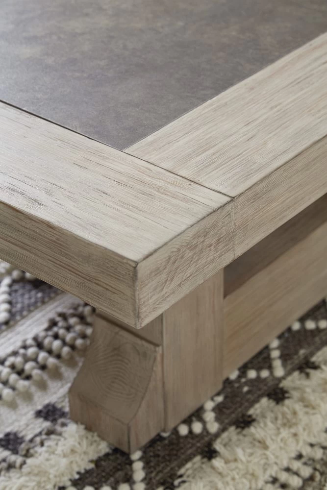A striking example of rustic refinement, this coffee table is generously scaled to accommodate your entertainment needs with ease. Made with pine wood and veneer beautified with a complex bisque finish, this designer coffee table includes a top with melamine insert for mixed media interest.