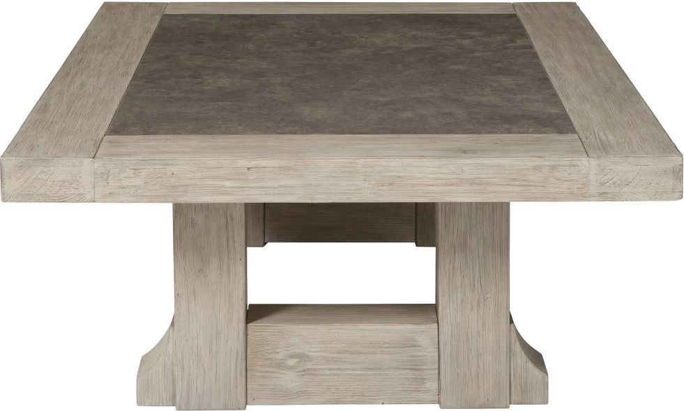 Casual style large scale cocktail table measures 54” x 40” to pair with large scale sofas and sectionals. Features solid wood frames with melamine inset panel. Made with pine solids and veneer in complex bisque finish.