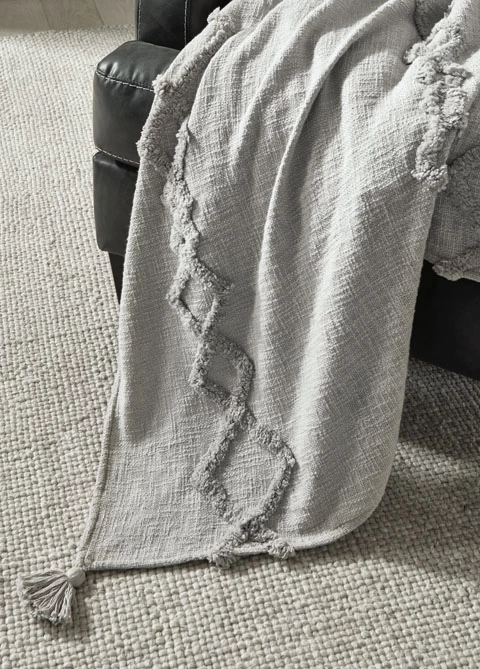 Cozy up to this tantalizing cotton throw with gray tone-on-tone raised design. Chunky tassels add so much flair. Place it over your furniture or shoulders for extra warmth.