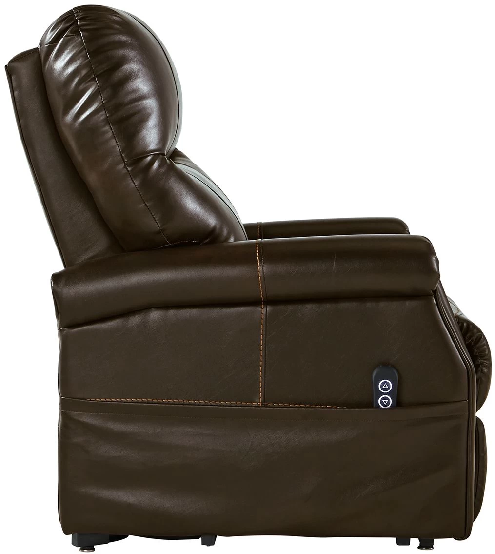Settle in on the Markridge power lift recliner, tailored in a cushioned, channel-tufted back with cozy rolled arm support. A handy side pocket keeps a one-touch power remote nearby so you can effortlessly change positions from reclined to upright.