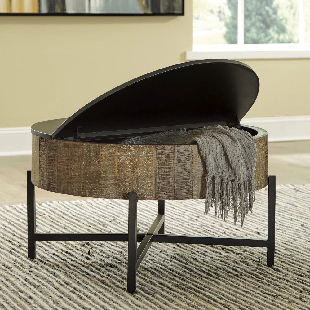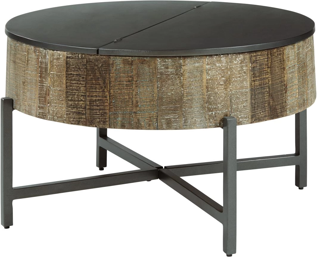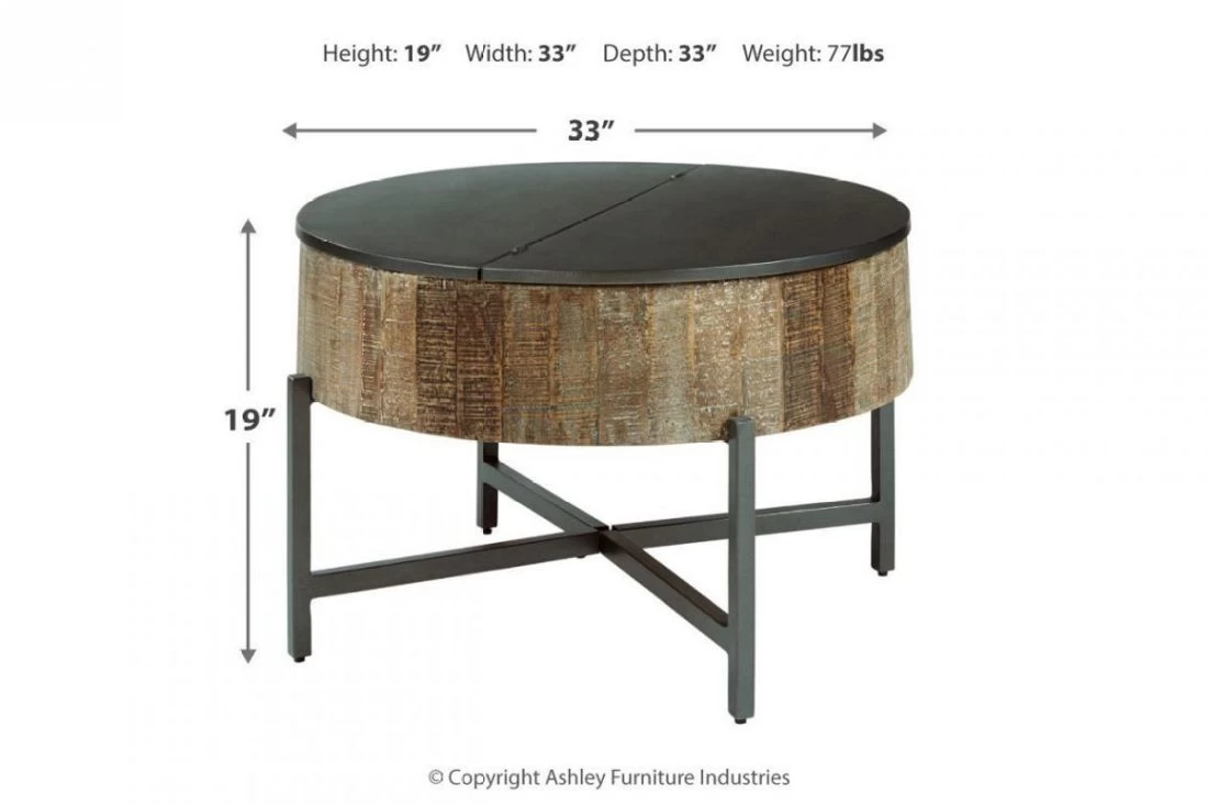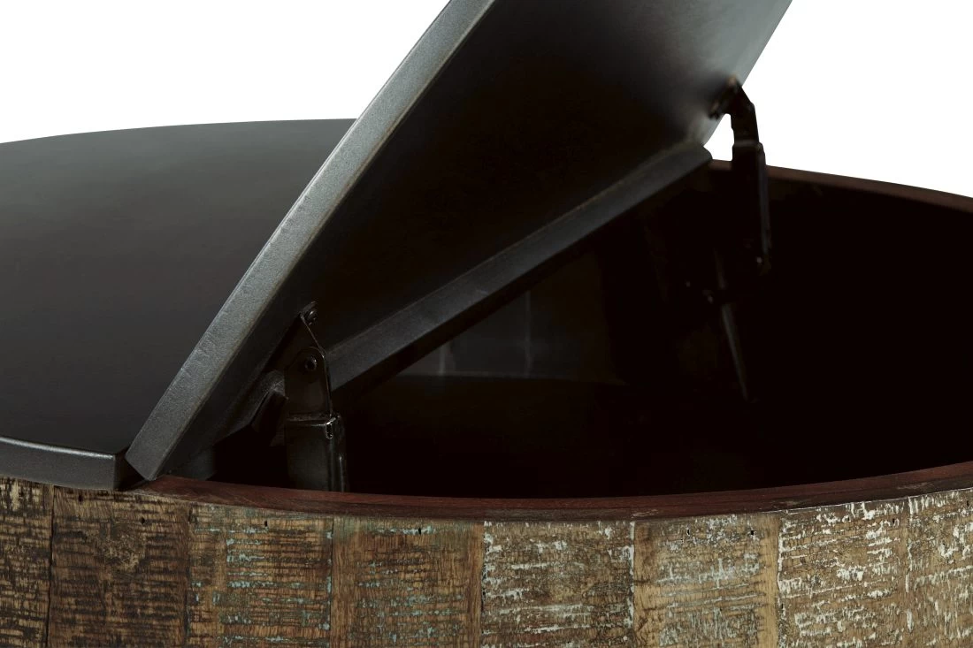 Bohemian rustic design. Made with Acacia wood solids, engineered wood substrate and metal frames. Finished with an earthy multi-color wood tone with white wax accents. Metal frames and the lids are finished in a gunmetal gray color. The unique drum design offers a convenient yet concealed format for alternate storage solutions. Size is perfect for use with smaller sofas and sectionals.