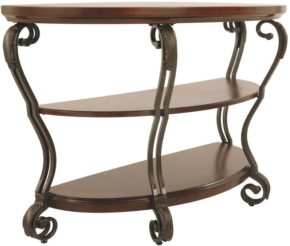 The Multi-tiered shelving and hand-applied finish of the Nestor half-moon sofa table table make your living room presentation even more grand. Its warm, medium-brown finish plays well inside spaces rich in earthy and neutral tones for an instantly cozy feel.