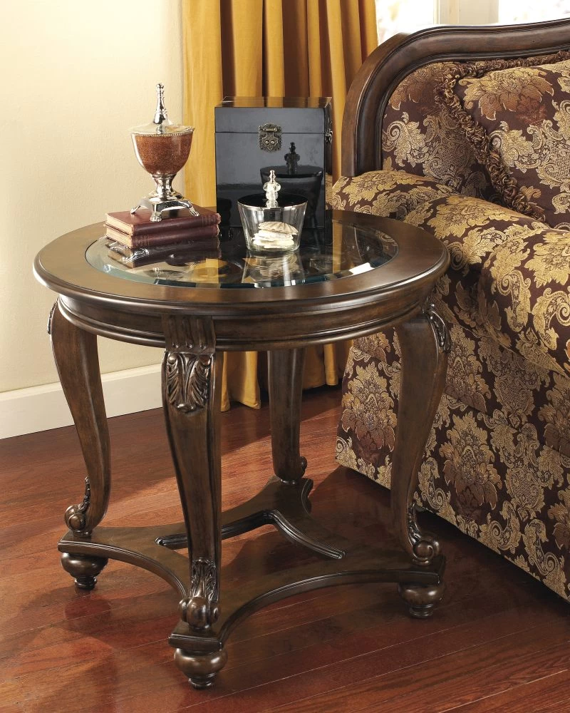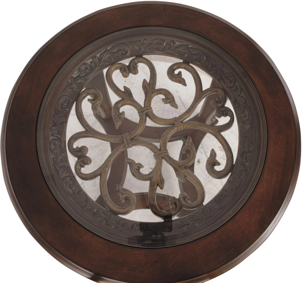 Brilliance is the Norcastle end table, featuring hand-finished wood, luxurious cabriole legs, accent stretchers, and beveled glass detailed with metal filigree underneath.