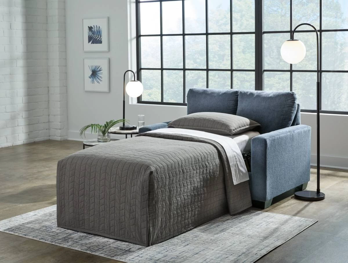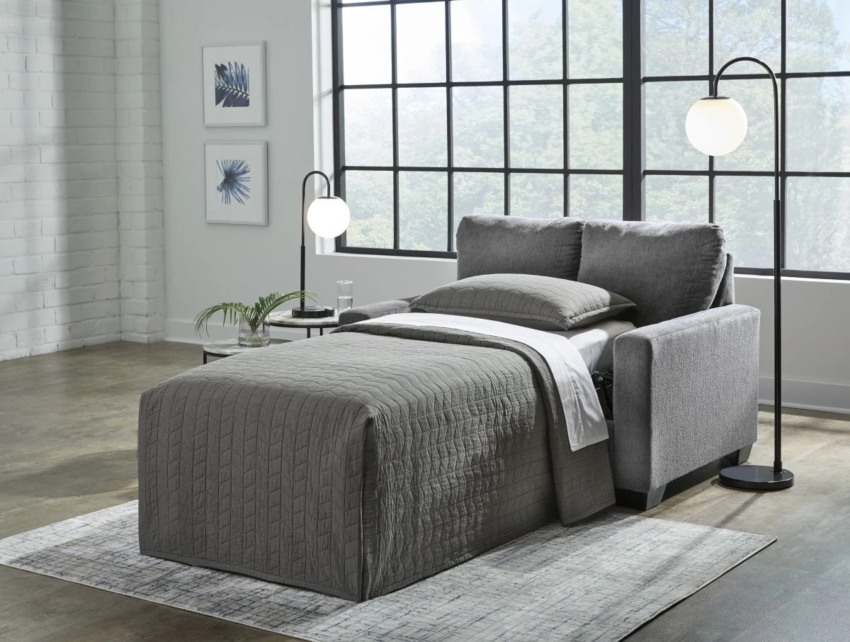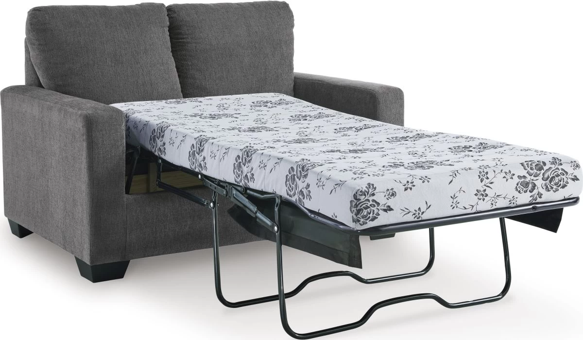 Included bi-fold queen memory foam mattress sits atop a supportive steel frame