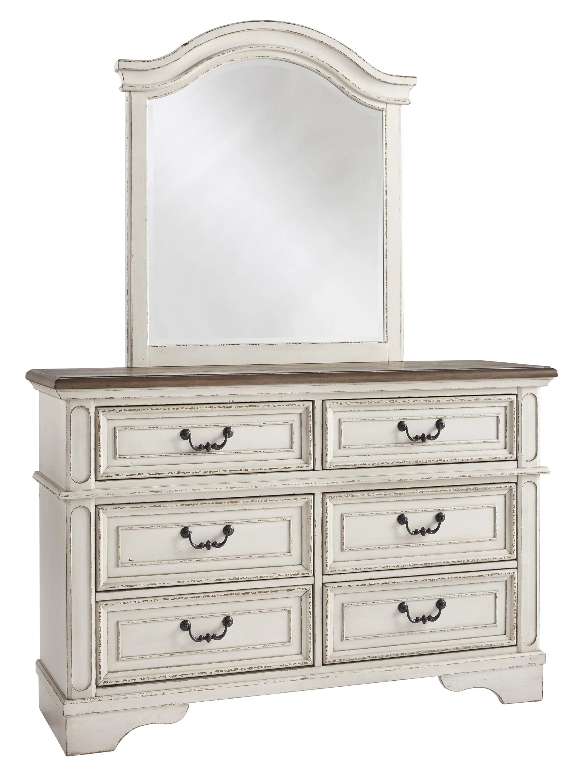 Traditional cottage design. Antiqued two-tone finish featuring chipped white cases with Birch veneers and hardwood solids.