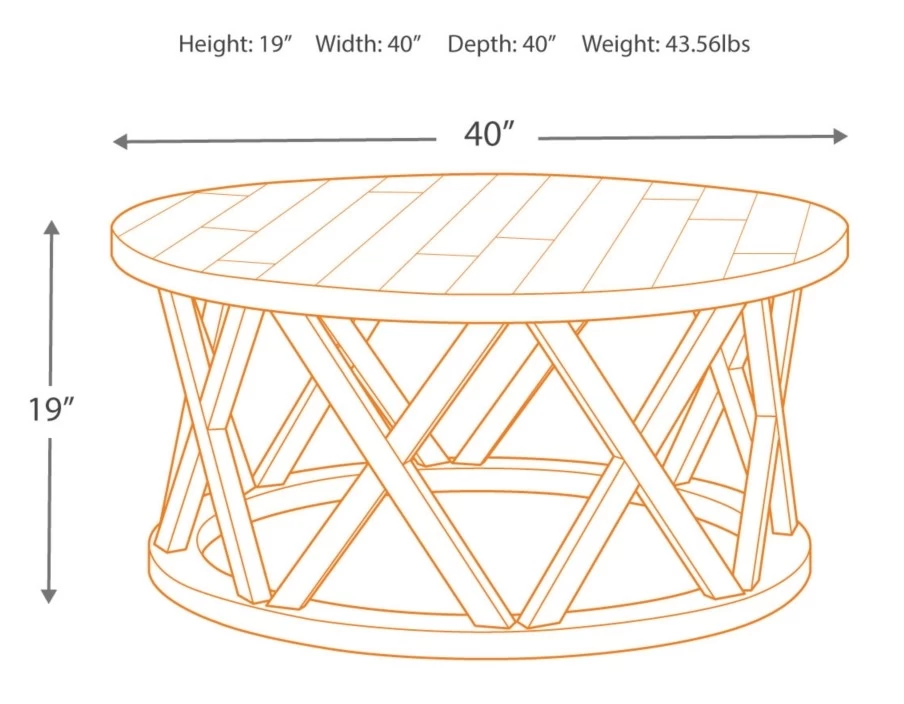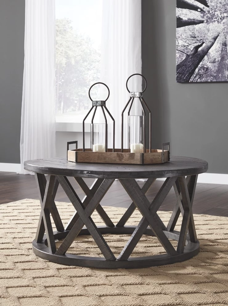 Show off your impeccable taste for attractive décor with the Sharzane round coffee table that features a gray, weathered finish on a planked tabletop with a drum-shaped base that features an “X” motif for the supports.