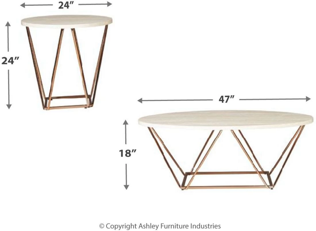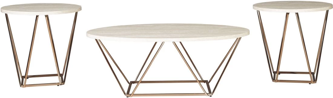 The Tarica occasional table set includes 1 coffee table and 2 end tables that feature gold-tone finished frames, and chic, faux-marble tabletops that round out this collection’s undeniable style.