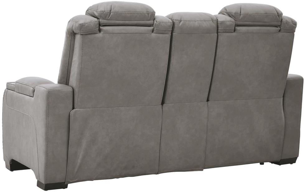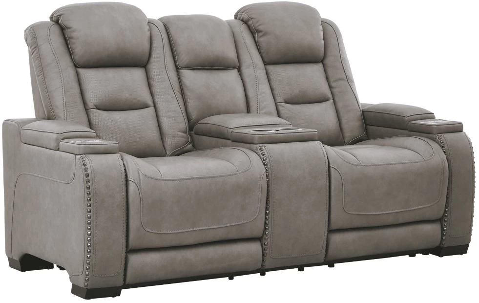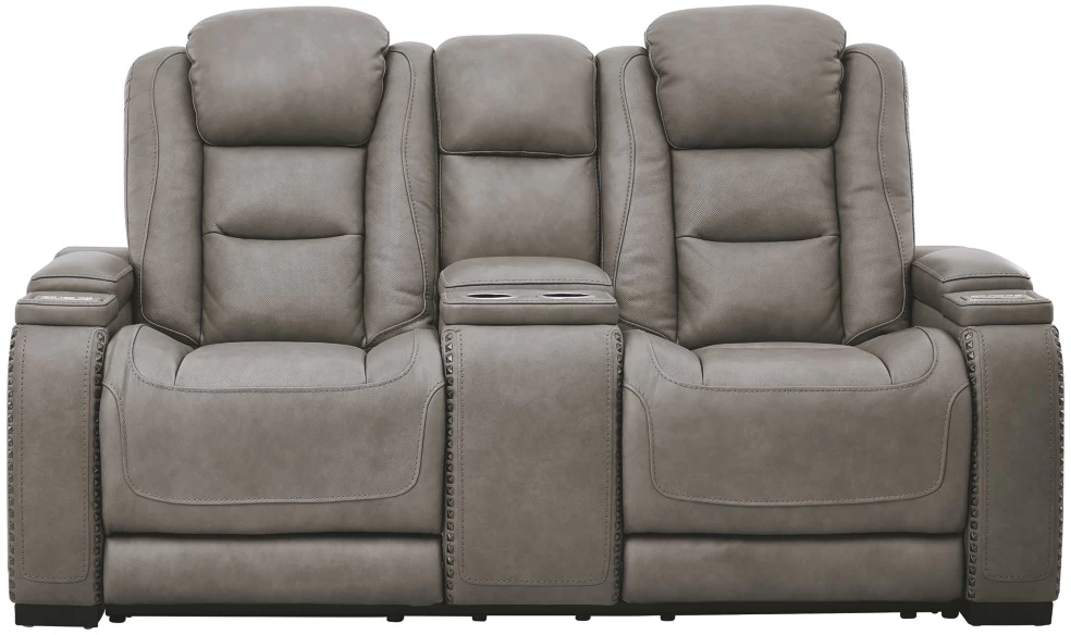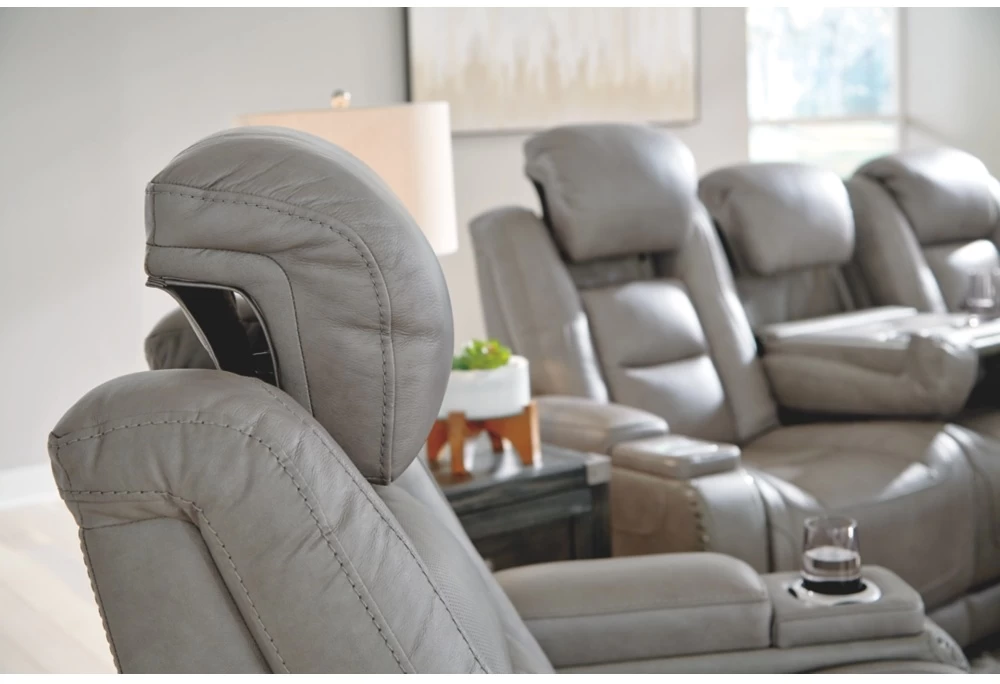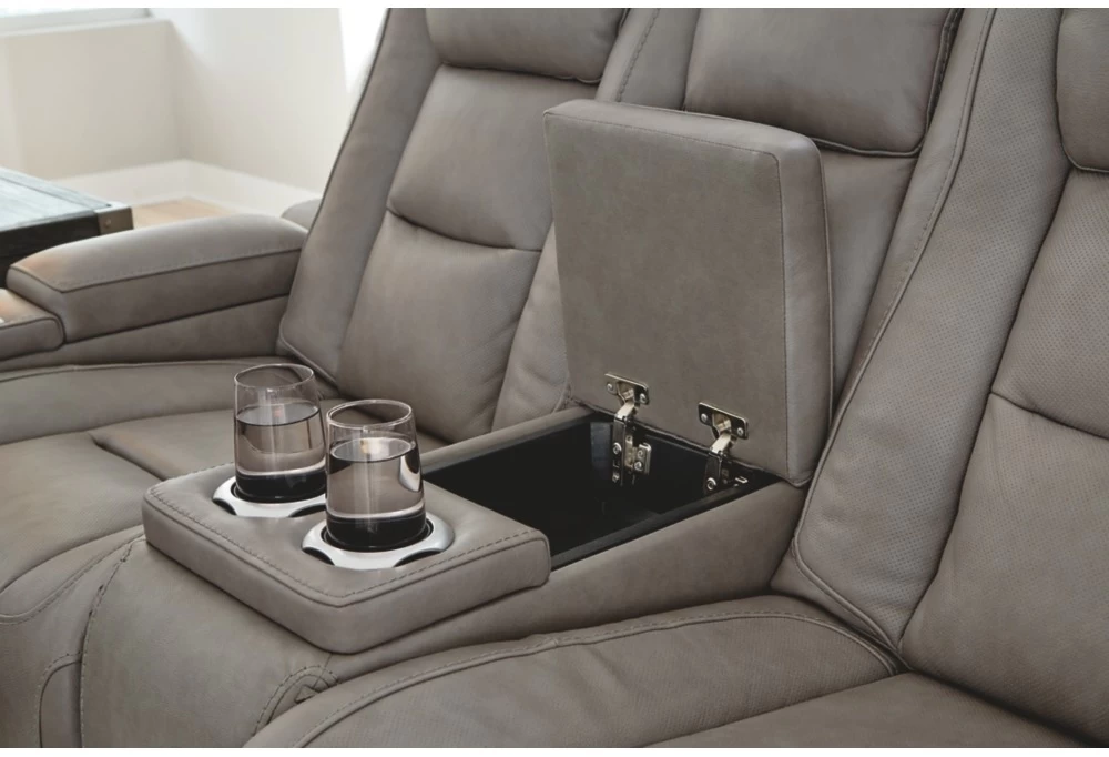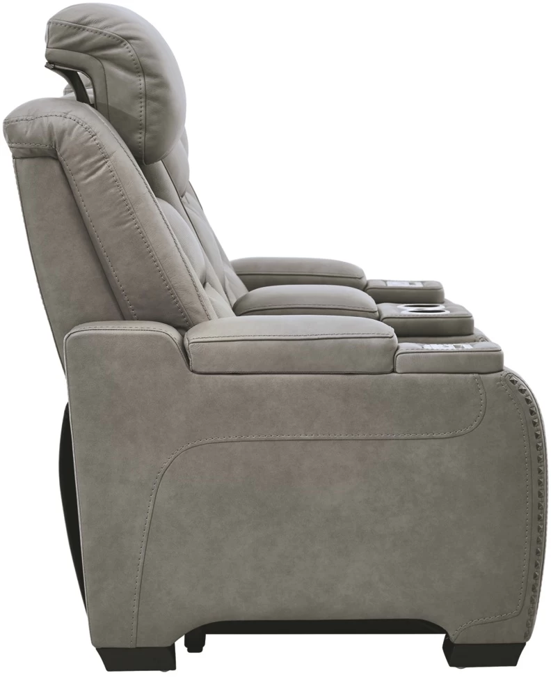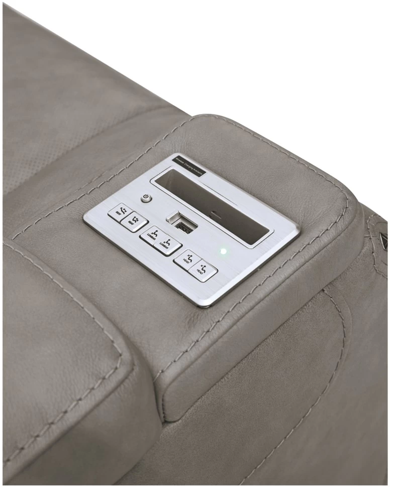Reserved for him and made for her, this power reclining loveseat in gray delivers all the comfort and style you could ask for. Inspired by sports car interiors, the seating area is covered in real leather for your pleasure, with a “perforated automotive” treatment for that much more appeal. Positioned at your fingertips, the advanced one-touch power control puts you in the driver’s seat with everything from an Easy View™ power headrest and power lumbar support, to a USB port and wireless charging for your phone. Talk about fully loaded. And with integrated cup holders and hidden storage compartments under the posh, padded armrests, this designer power reclining loveseat makes the most of every inch of space.