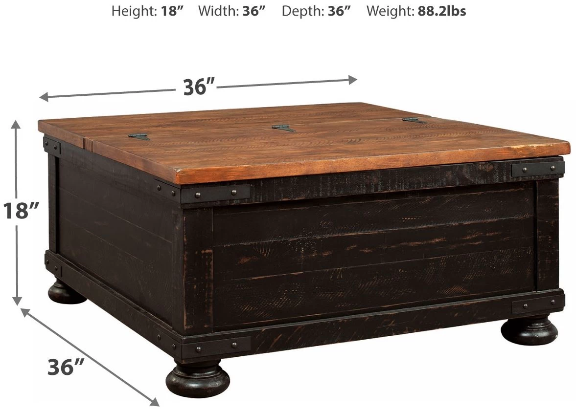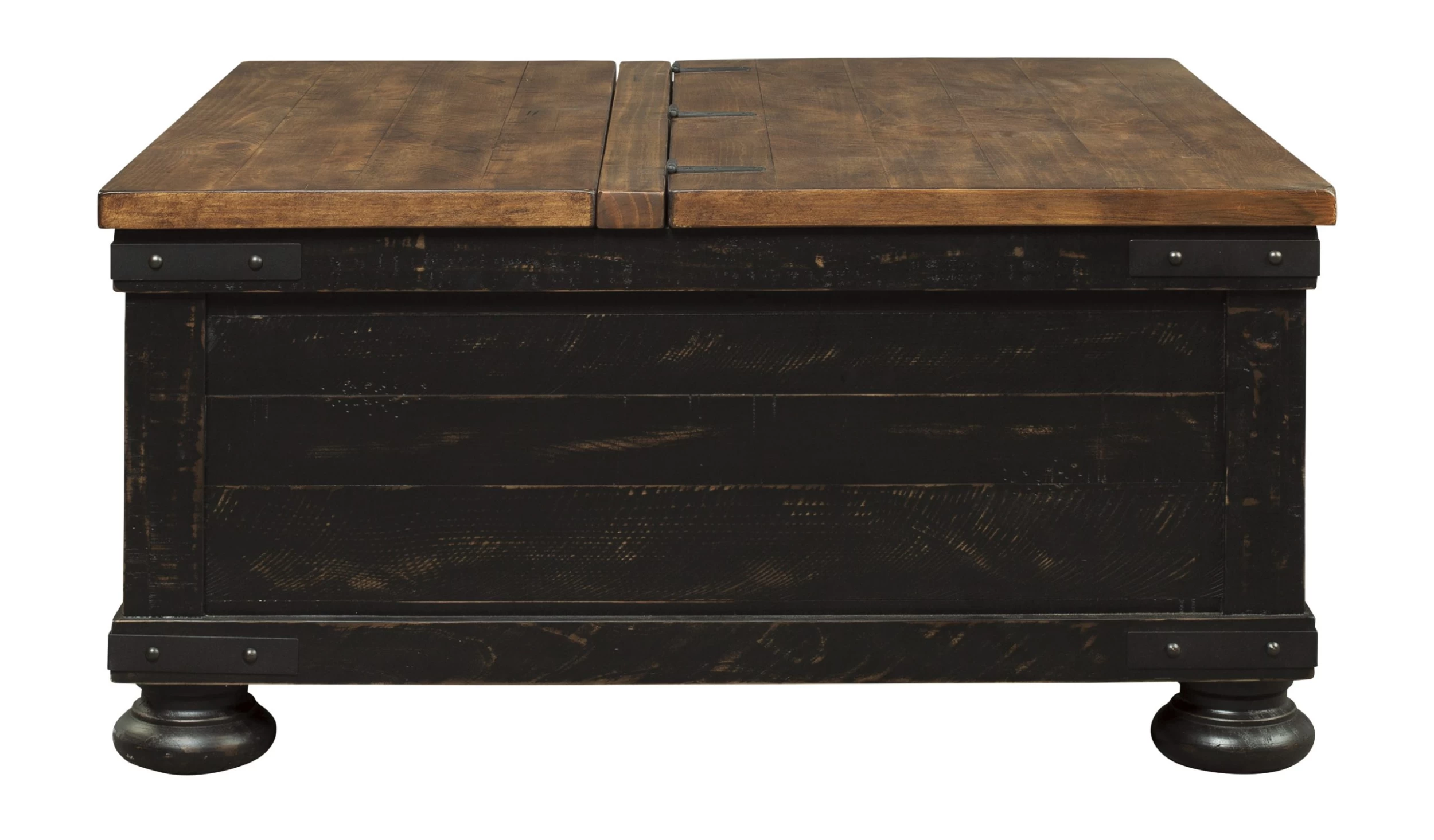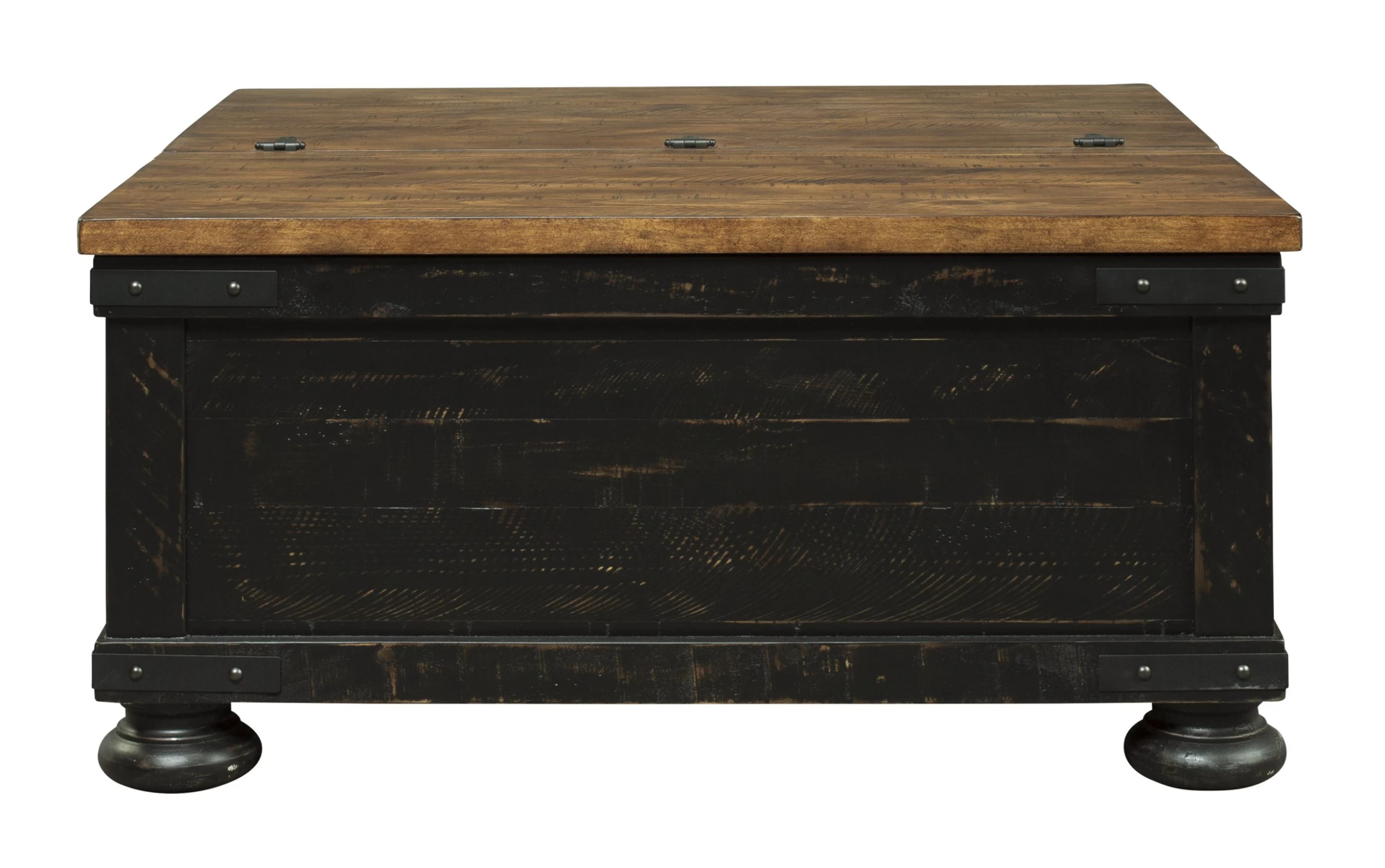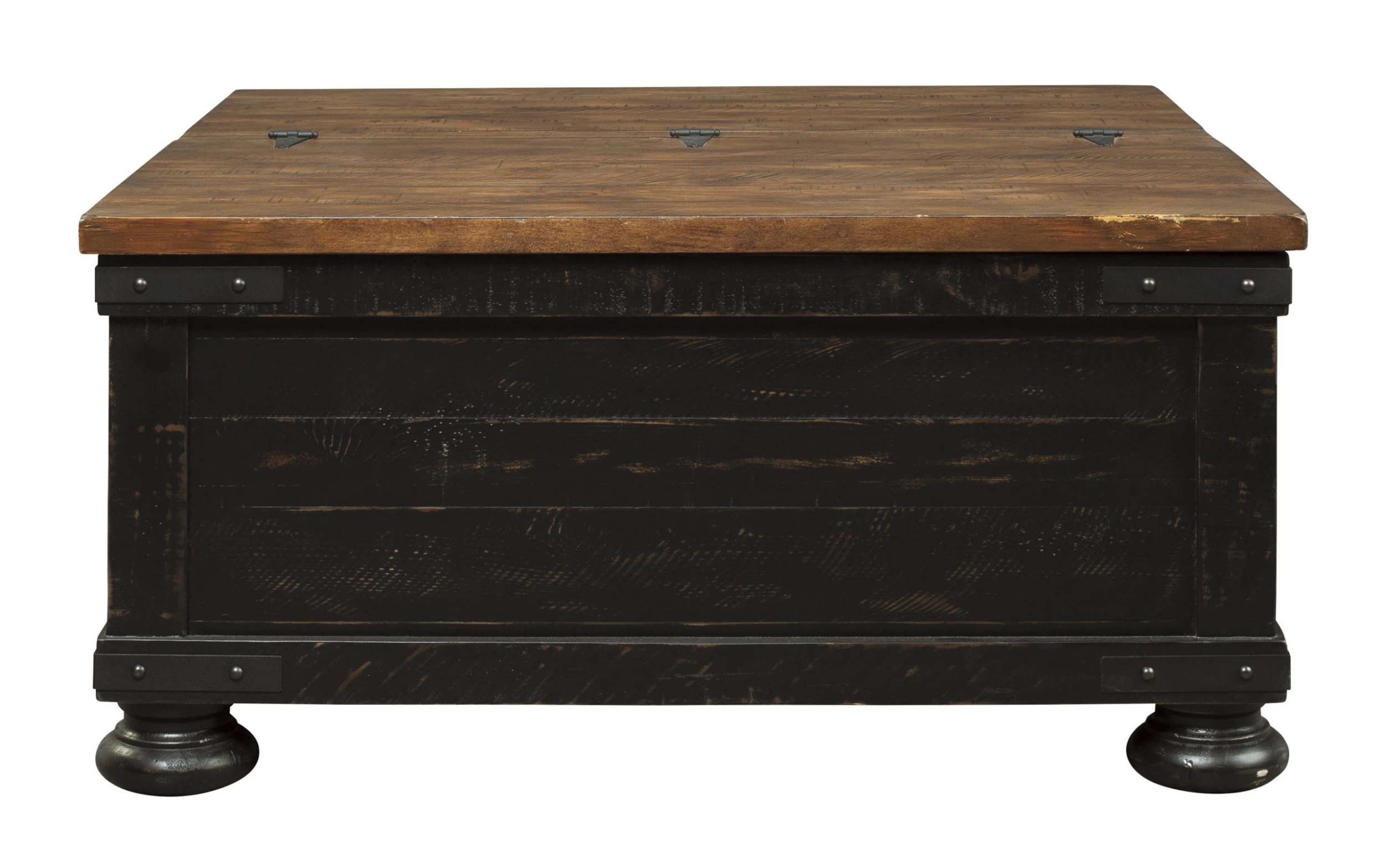 Function and style ring from the two-tone, split lift-top Valebeck coffee table. Lift part of the natural pine wood finished-top for storage and prop the other side up whenever you need. The plank styling and bun feet fuse farmhouse feel with industrial-chic fashion.