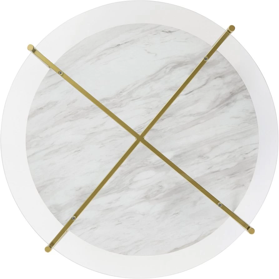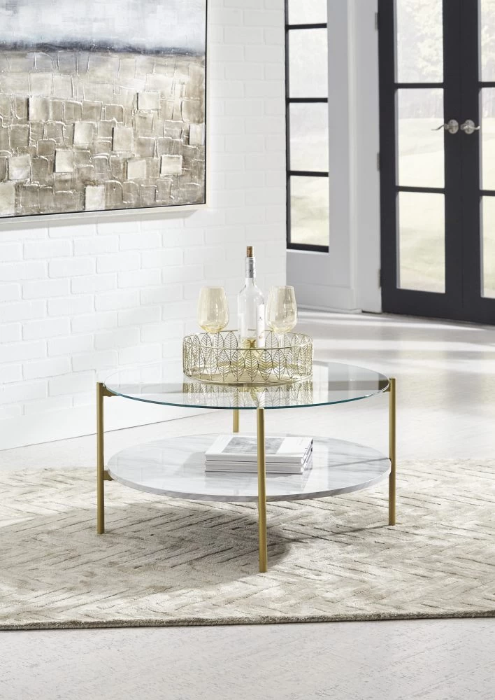 Add a bright spot to your contemporary space with this cocktail table. A clear glass top provides a great view of the replicated Carrara marble shelf below. A goldtone finish on the metal frame heightens the modern aesthetic.