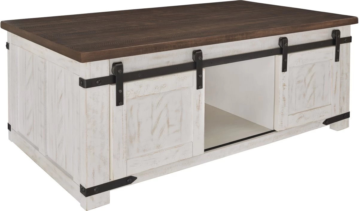 This coffee table is expertly crafted with a distressed vintage white finish and contrasting aged natural pine tabletop. This generously sized coffee table combines a look you’ll love with the storage you need. Sliding barn doors on both sides hide easy-access storage cubbies perfect for magazines, throws, board games and more. An open shelf in the middle provides more storage or room for decorative items. This attractive table blends rustic and natural style while lending a unique feel to your home.