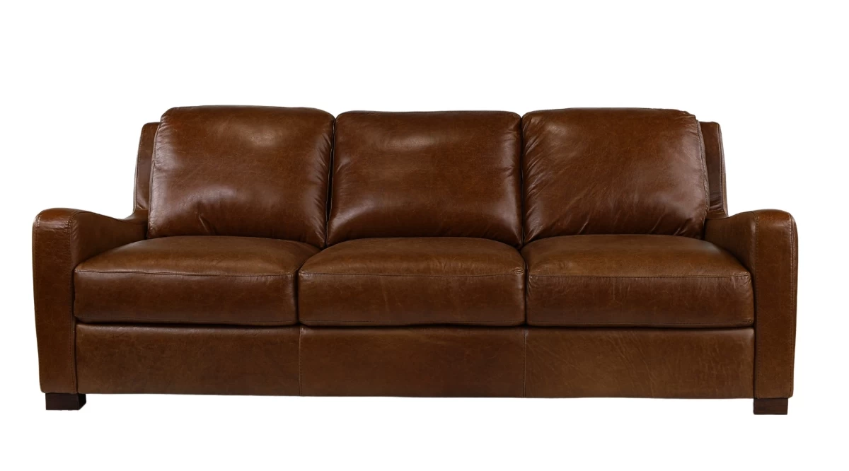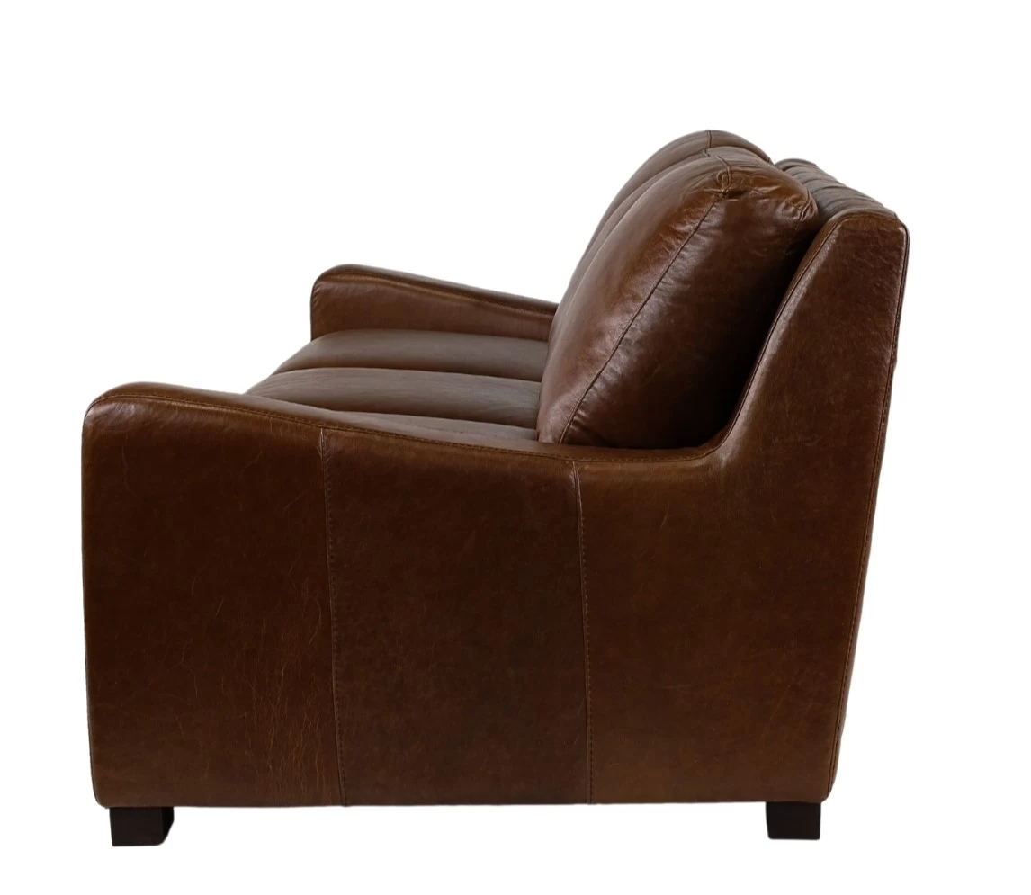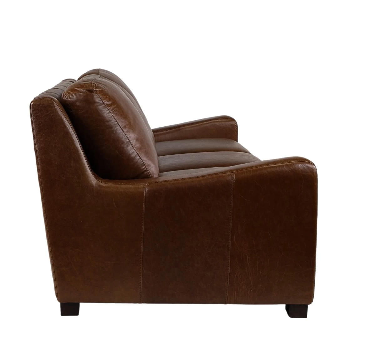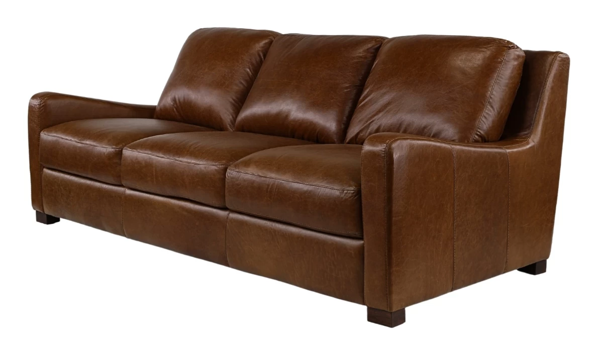 This sofa from Soft Line is covered in the leather 10802 Splendor Chestnut. This collection features all top grain leather, padded outside and back arms, and memory foam seating. Along with the sofa, you can purchase the matching loveseat, chair, and ottoman to complete your living area!