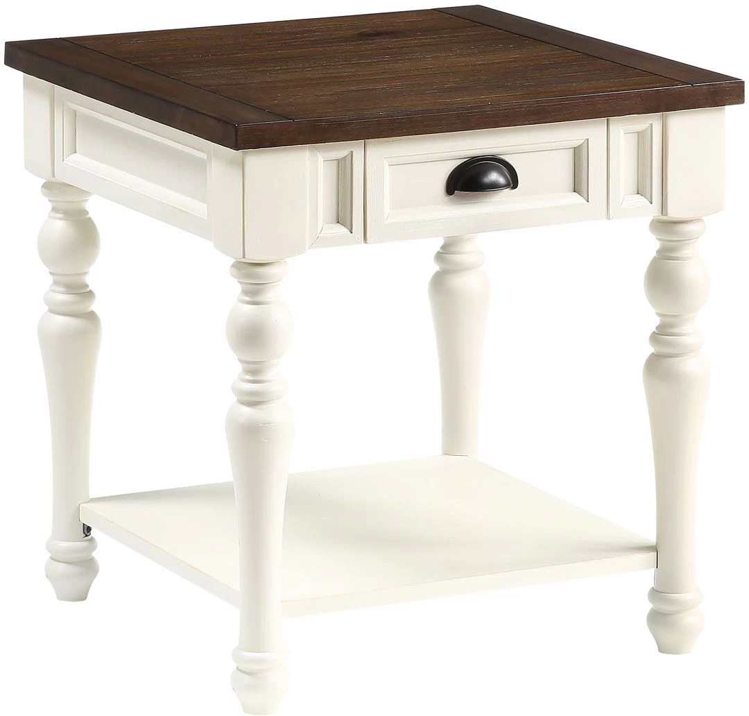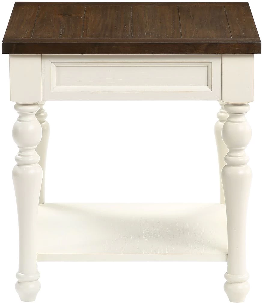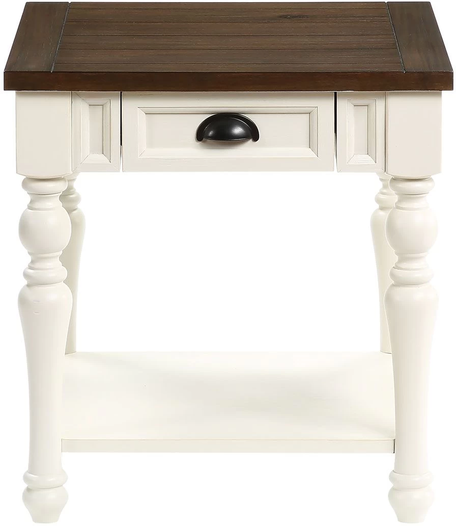 A working drawers with half-moon nickel hardware adds hidden storage to any room while the units’s bottom shelf adds storage and/or display area while adding structural stability. Matching Sofa Bar and dining sets are available from this comprehensive farmhouse collection.