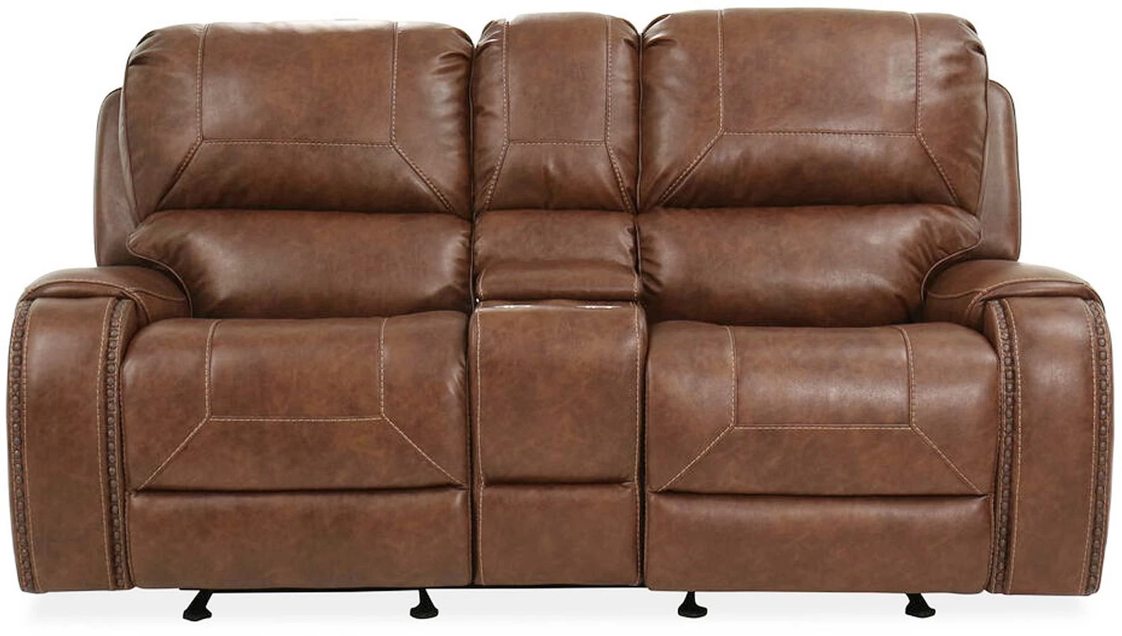 The loveseat has dual glider/recliner ends and features console with hidden storage and 2 cupholders; also has 2 USB charging ports and electrical outlet