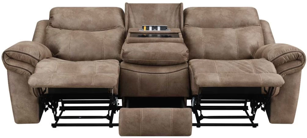 The center drop-down console with slow-release pop-up USB charging station include 2 electrical outlets, 2 USB ports, 2 Cupholders; a hard surface with wood grain and upholstered pouch for remotes or magazine storage.