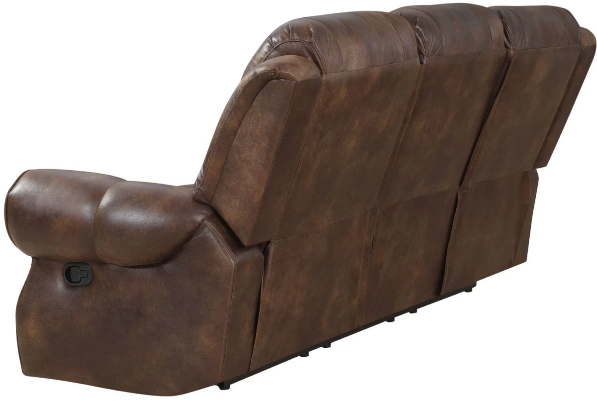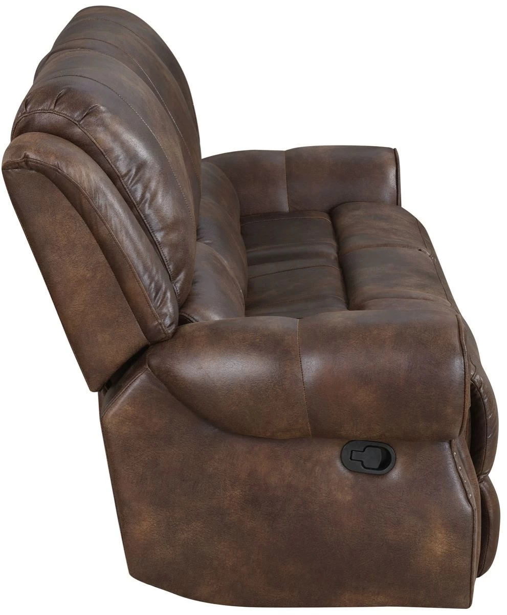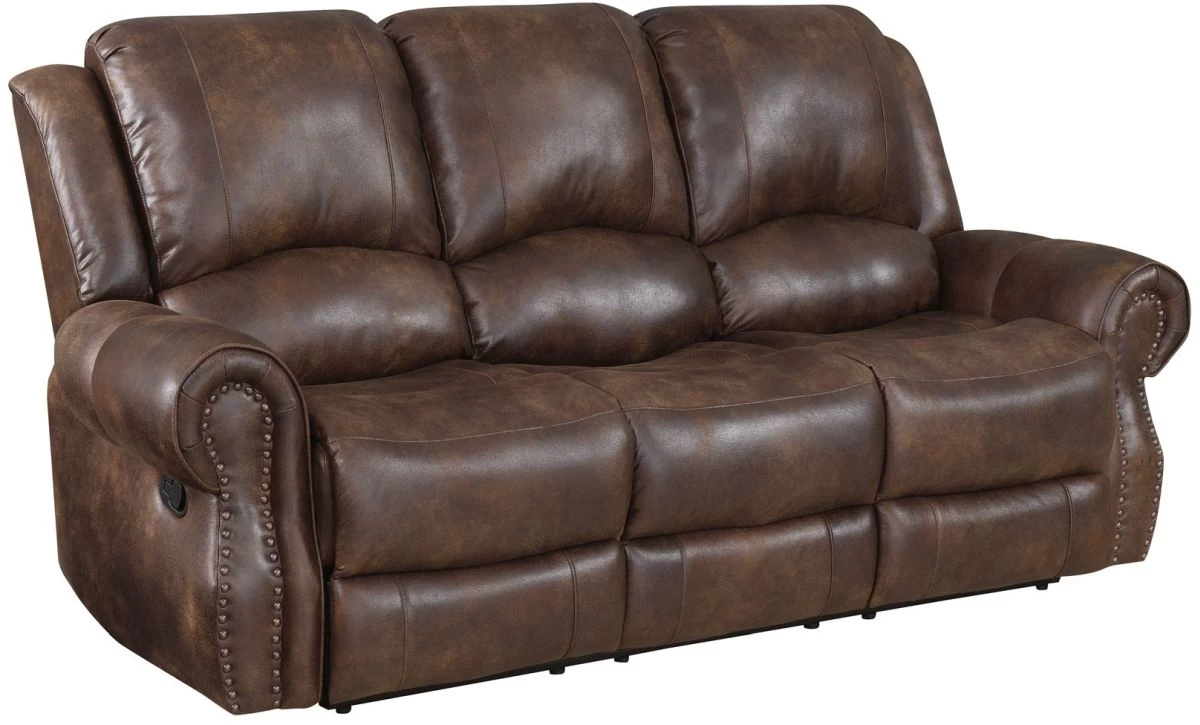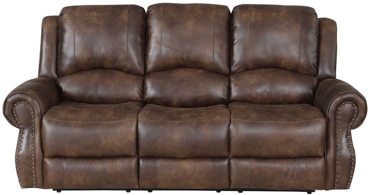 The Navarro Manual Recline Sofa represents modern ranch style in a rustic silhouette that looks great and sits even better. The fabric cover has the look and feel of classic weathered leather and is tailored over a shaped seat with a bustle wingback for extra comfort. This Sofa works well as part of a 3-piece group or as a standalone seating option that seats three. The extra padded arms feature antiqued brass nailhead trim and the chair easily kicks out to a full 66 inches of reclined bliss with the pull of a lever.